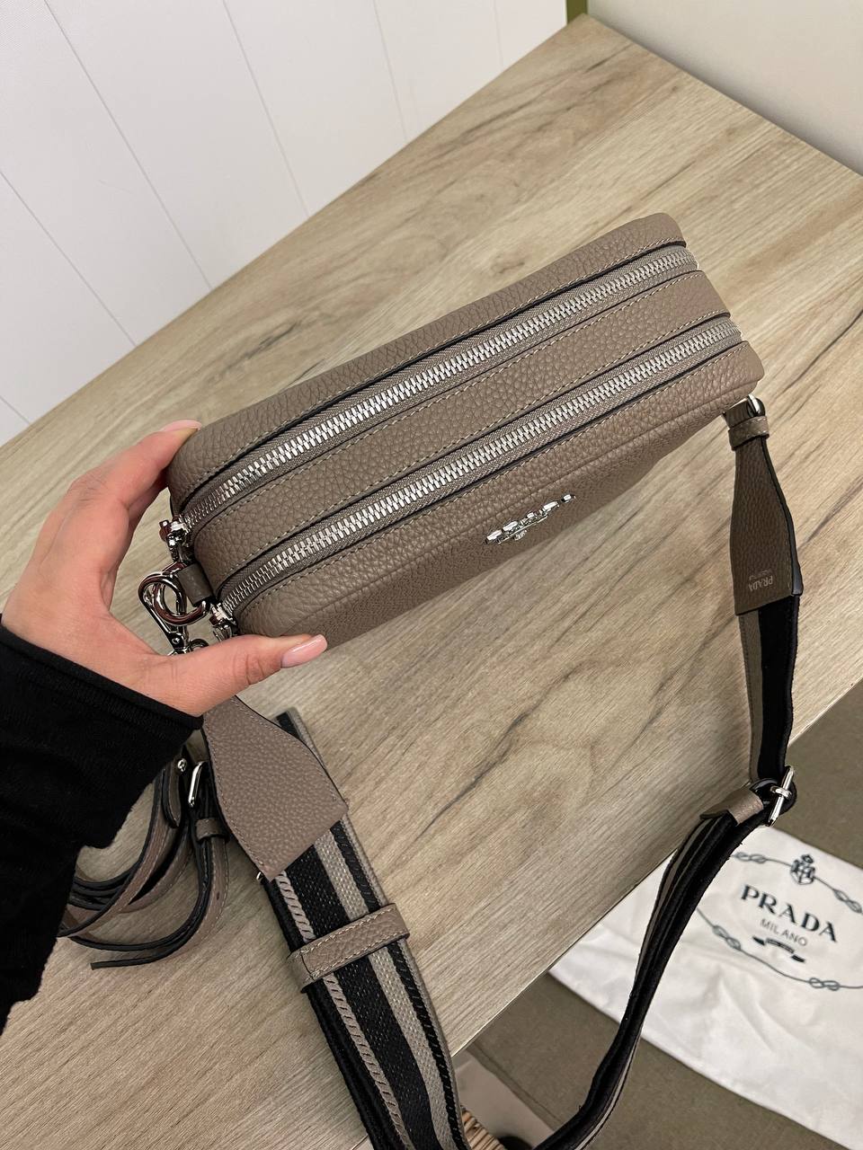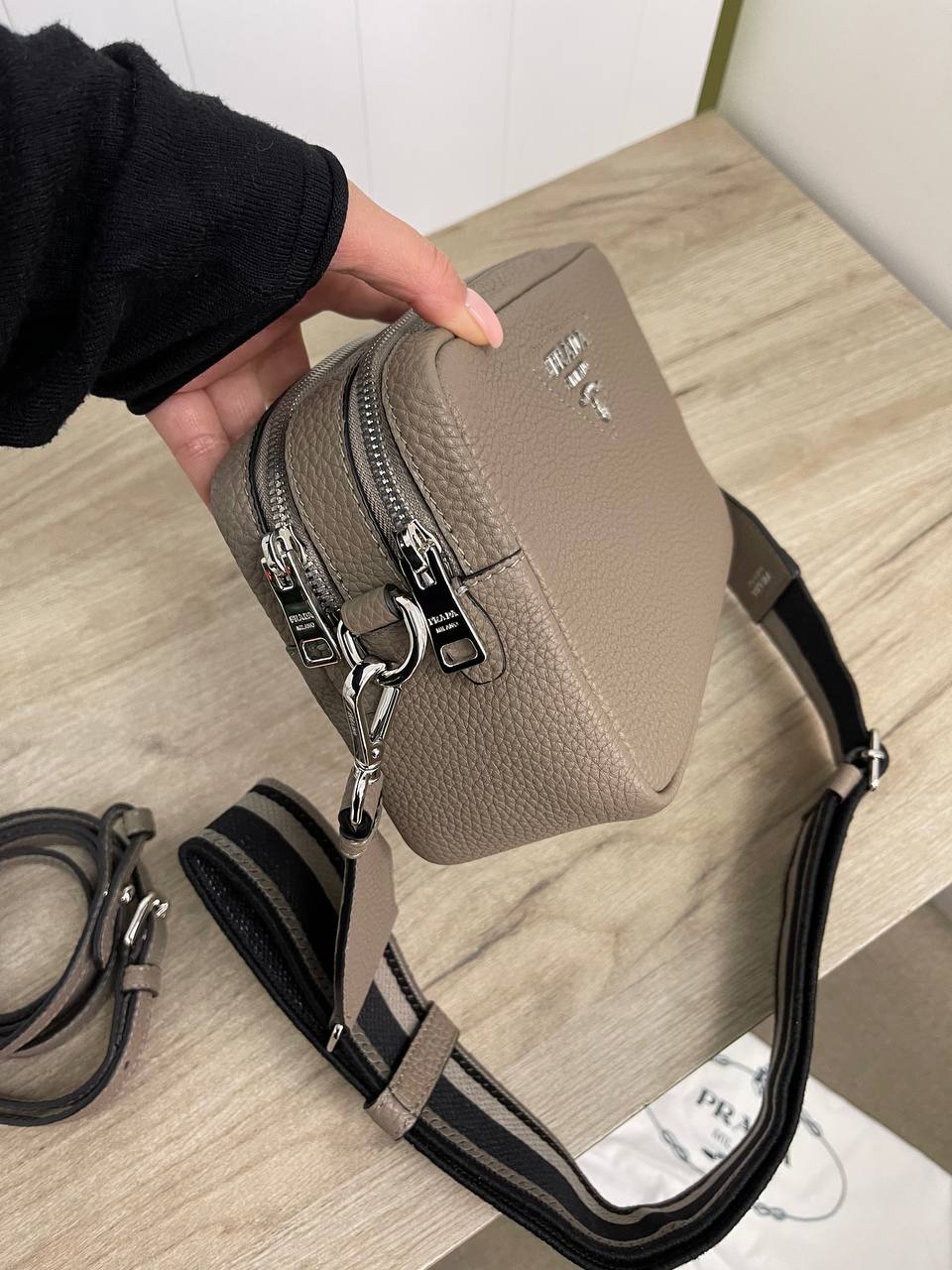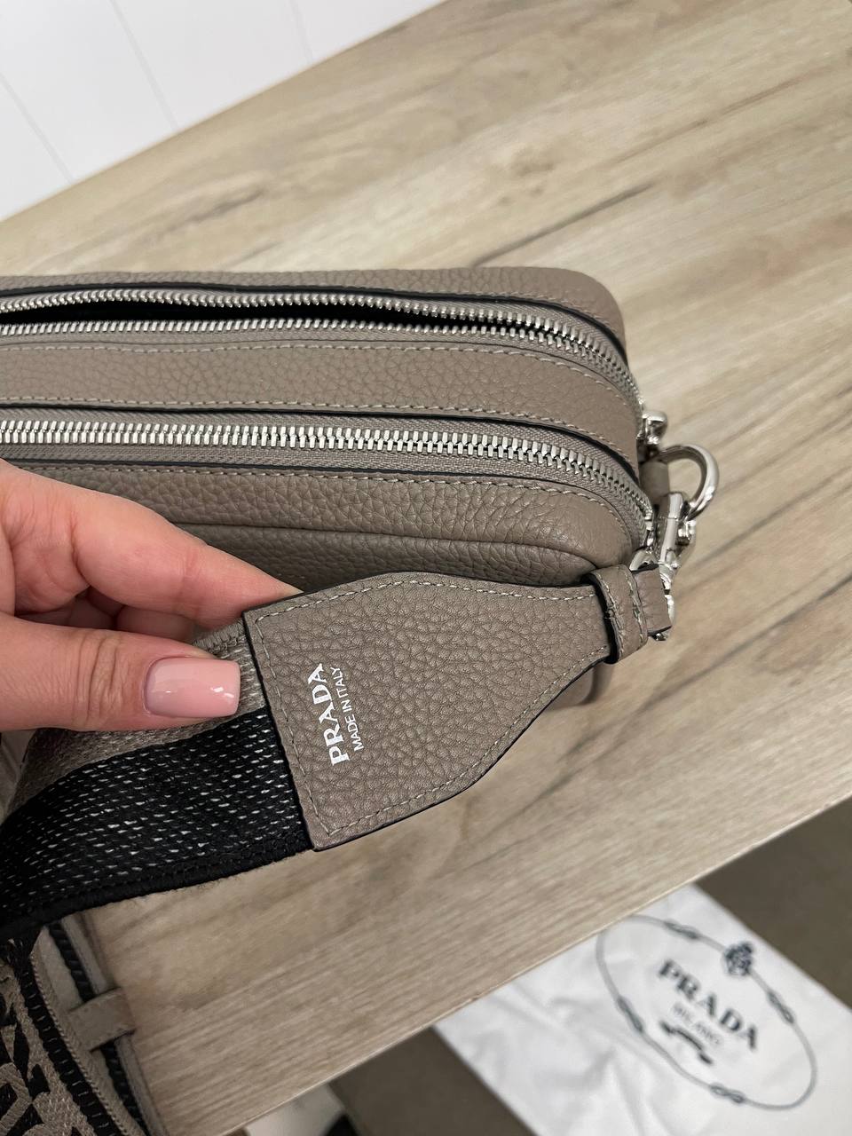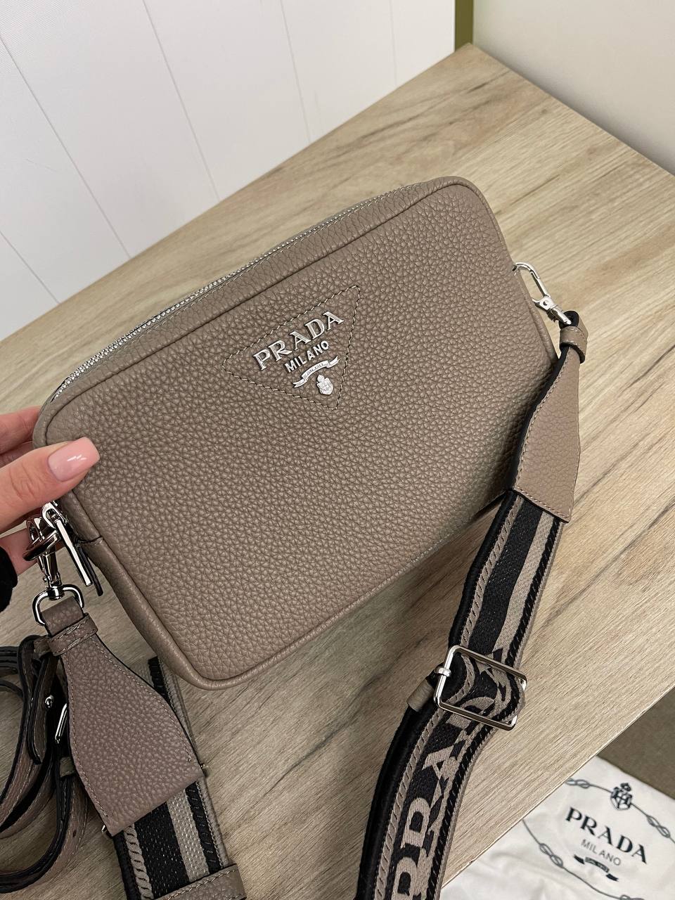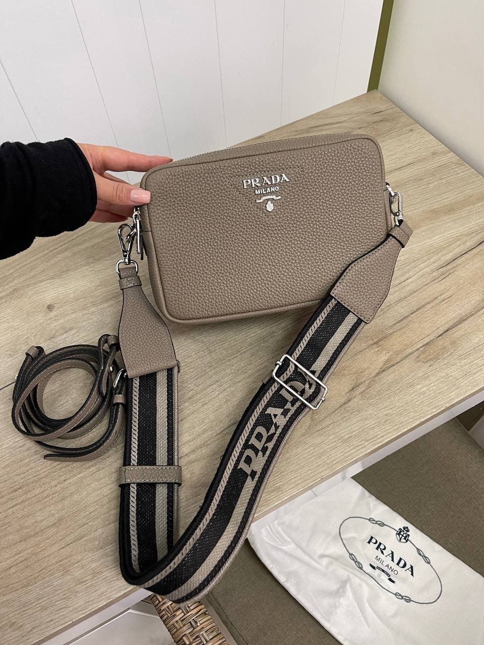 Судя по изображению, перед вами женская сумка Prada LUX-82977. Это стильный аксессуар прямоугольной формы, выполненный в нейтральном серо-коричневом цвете. Сумка имеет зернистую текстуру и комплектуется съемным ремнем с логотипом бренда.