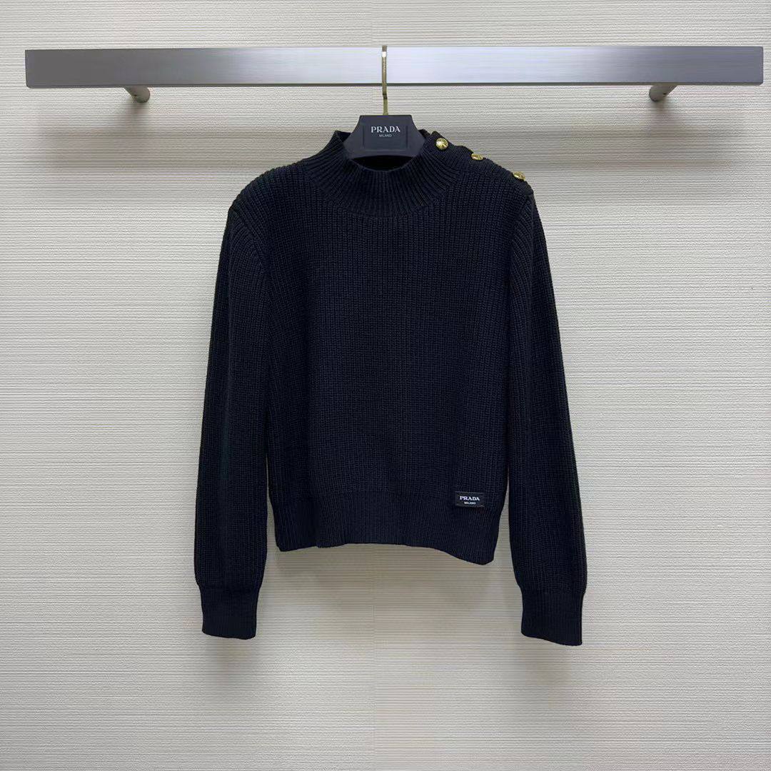 Свитер женский Prada LUX-96814 — это элегантный предмет гардероба от известного бренда. Свитер выполнен в классическом стиле, с высоким воротником и акцентными деталями в виде золотистых пуговиц. Он имеет приятную текстуру и насыщенный черный цвет, что делает его универсальным для различных образов.