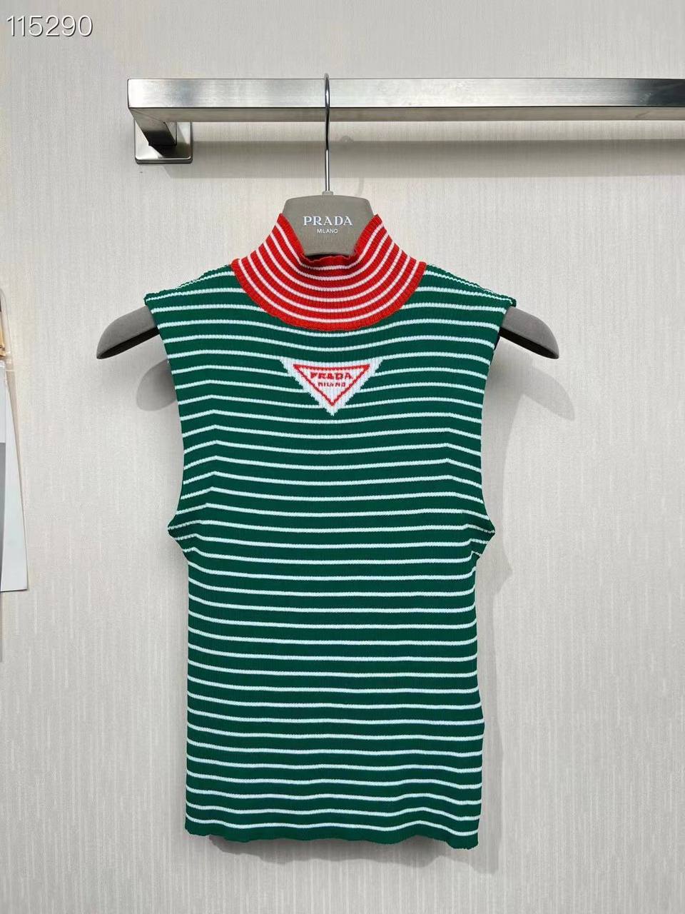 Топ Prada LUX-72708 — это стильный топ с полосатым дизайном и высоким горлом. Зеленый цвет изделия дополняют белые полоски, а также красная отделка на горловине. Этот топ станет прекрасным дополнением к повседневному образу, добавляя изысканности и неповторимости.