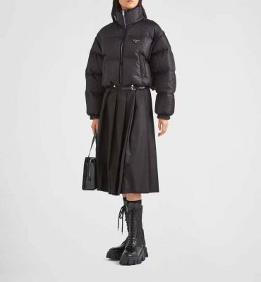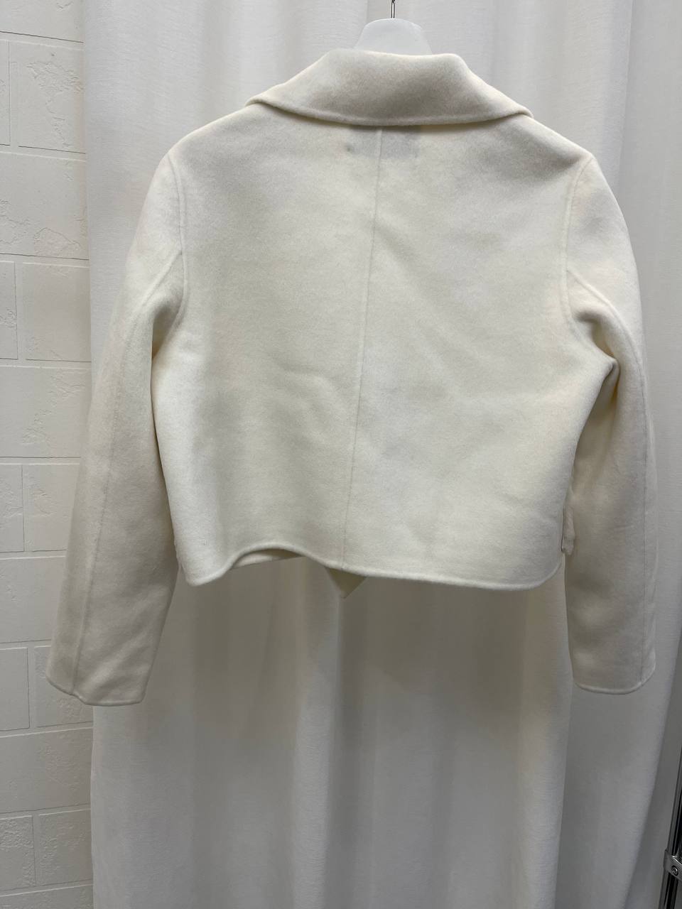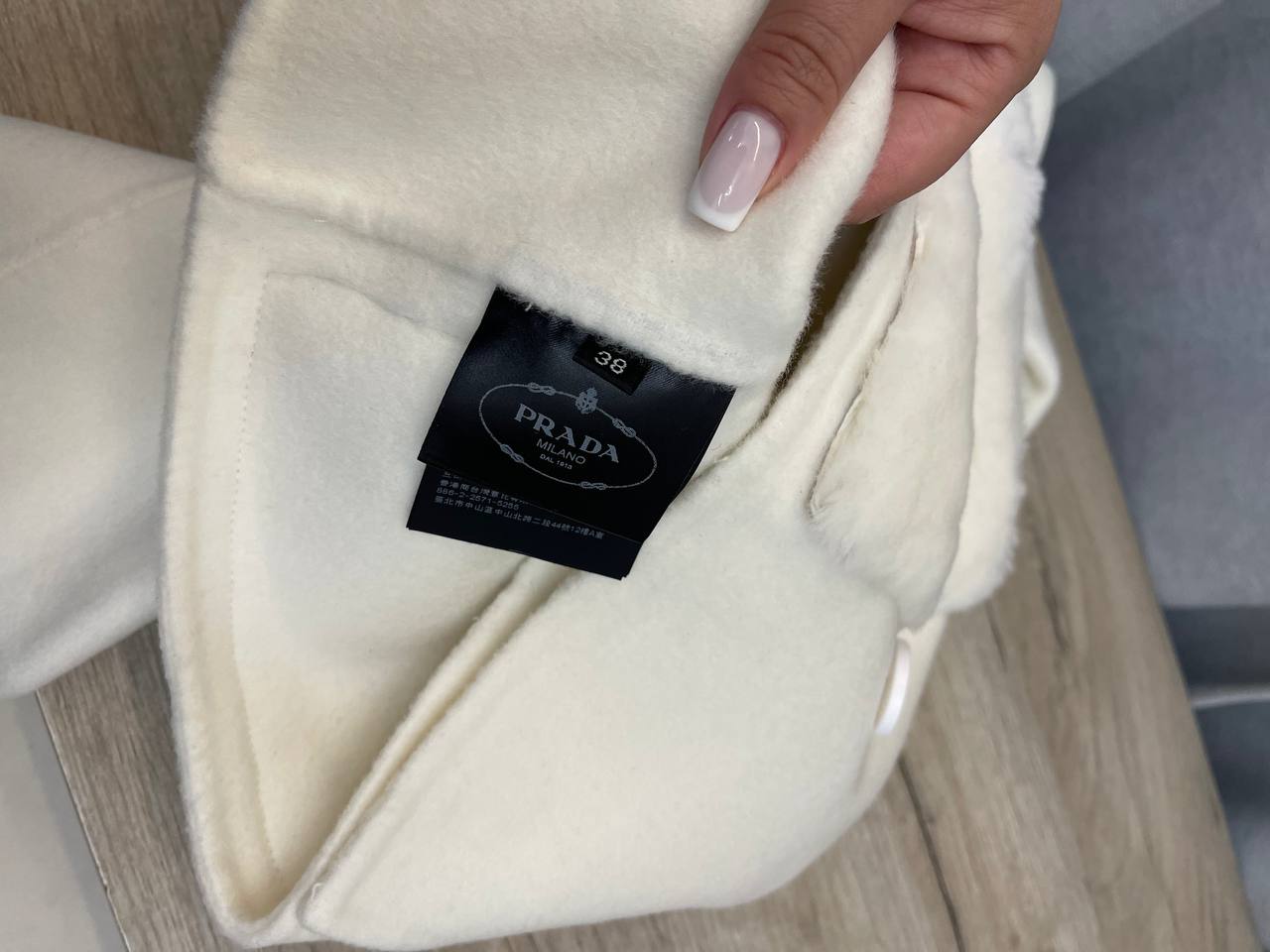 Укороченное пальто Prada LUX-94808 — это стильная верхняя одежда, сочетающая в себе элегантность и современный крой. Пальто выполнено в молочном оттенке, что придает ему универсальность и позволяет сочетать с различными элементами гардероба. Укороченная модель идеально подходит для создания модных образов в демисезонный период.