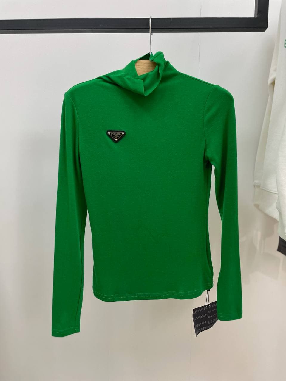 Эта яркая зеленая водолазка Prada LUX-59958 — идеальное сочетание стиля и комфорта. Она обладает классическим дизайном с высоким воротом и длинными рукавами, что делает ее универсальной основой для множества образов. Небольшой треугольный логотип Prada на груди подчеркивает элегантность и узнаваемость бренда.