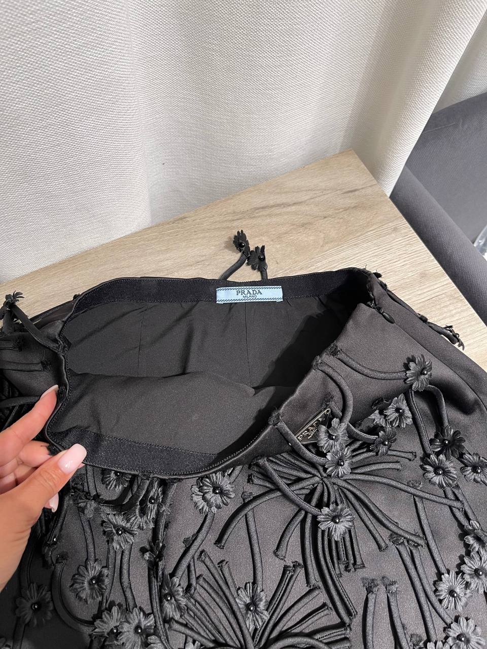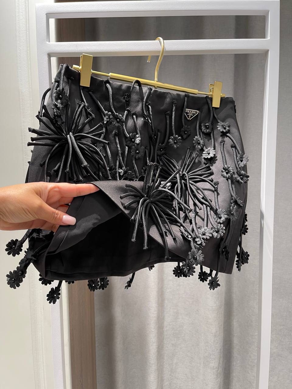Элегантная юбка от Prada – это сочетание изысканности и современного дизайна. Модель выполнена в классическом черном цвете и декорирована оригинальными элементами. Идеальный выбор для создания стильного образа.