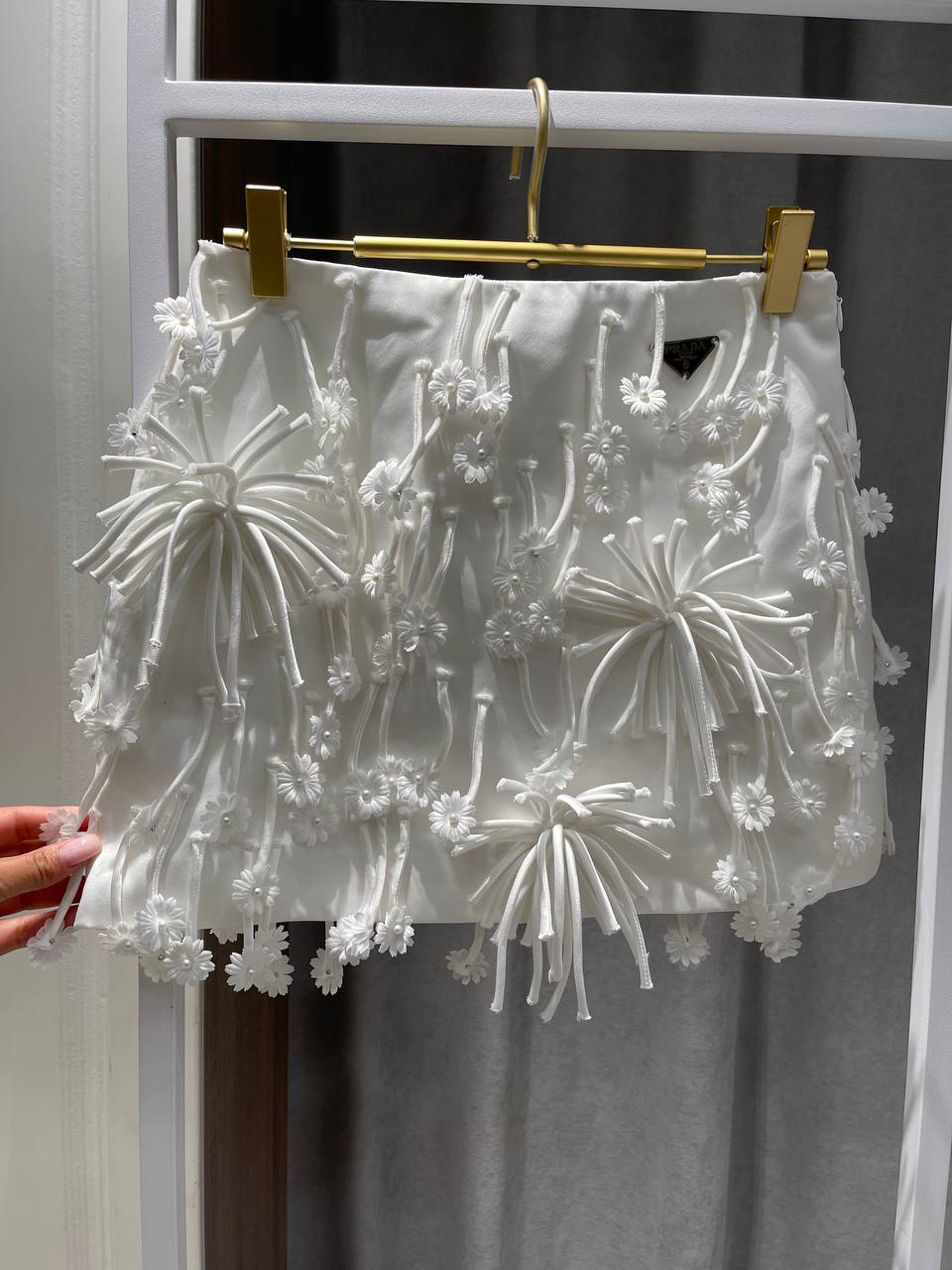 Это короткая белая юбка Prada с оригинальным декором в виде объемных цветов и нитей, создающим текстурный эффект. Стиль юбки — праздничный, подчеркивающий женственность.