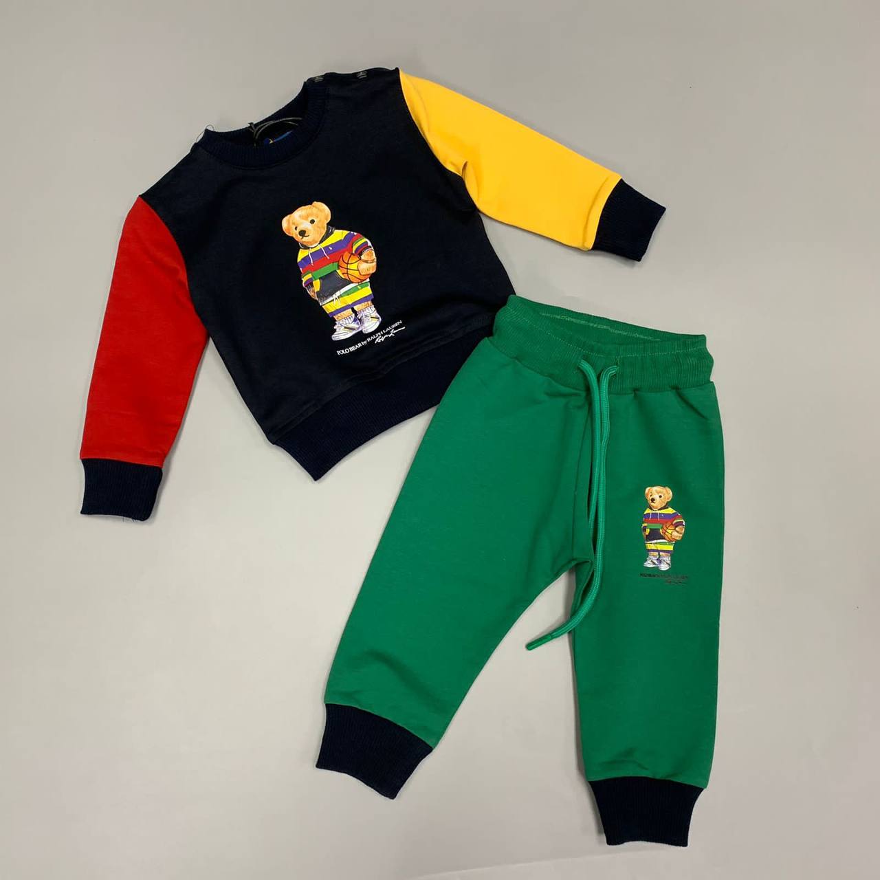 Костюм Ralph Lauren LUX-91859 - это стильный комплект для детей, включающий в себя свитшот и штаны. Свитшот выполнен в сочетании черного, красного и желтого цветов с изображением медведя в спортивном стиле. Штаны зеленые, дополнены темными манжетами и рисунком медведя.