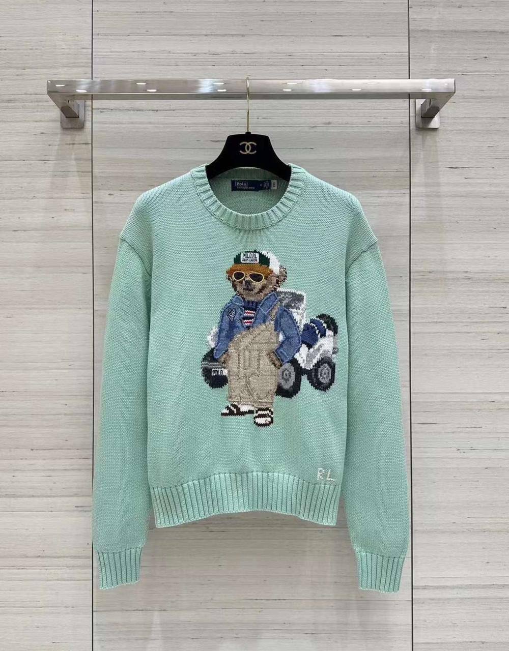 Это стильный свитер Ralph Lauren с изображением мишки в кепке, сидящего на гольф-каре. Дизайн полотно и рисунок выполнены в нежных пастельных тонах.