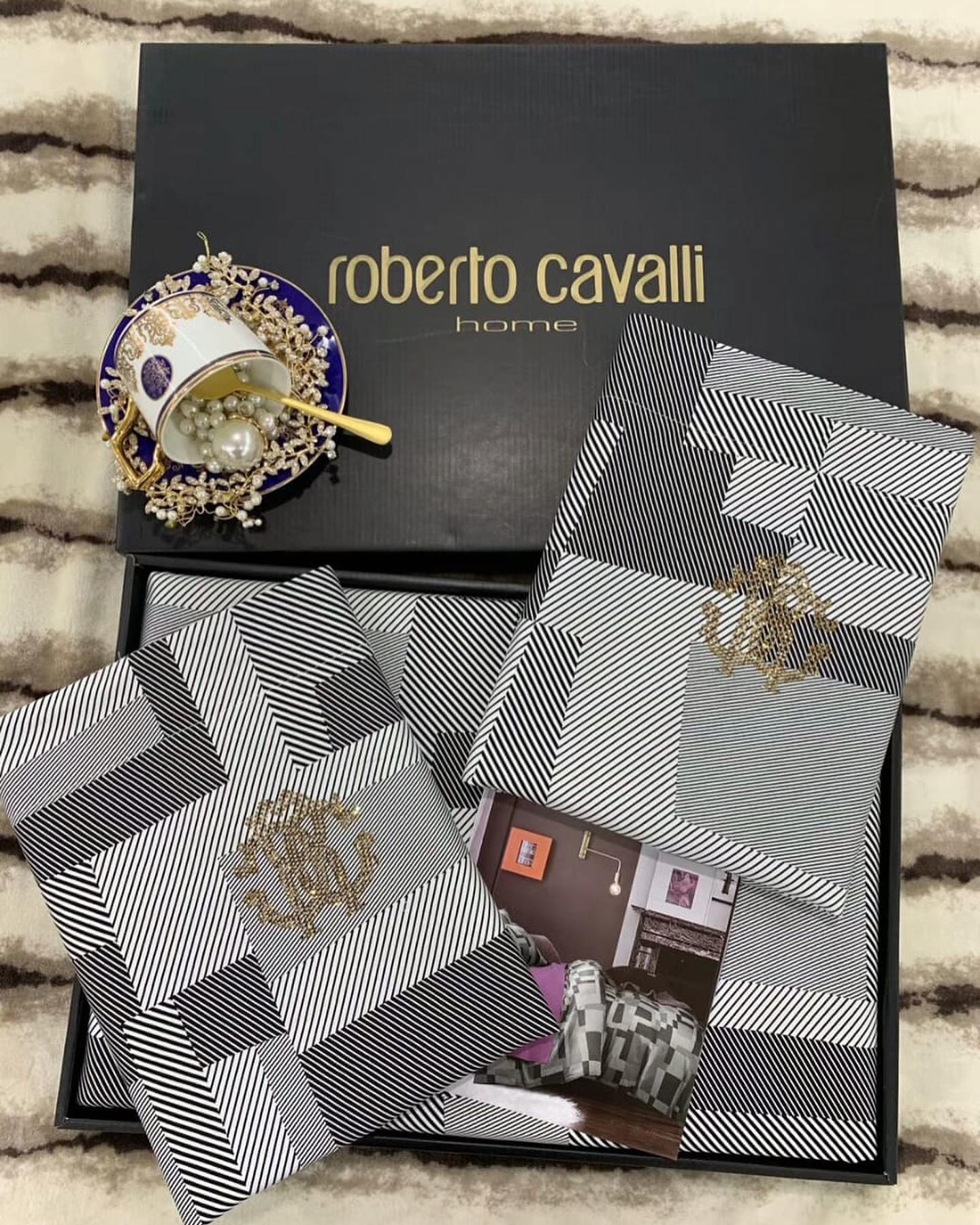 Комплект постельного белья Roberto Cavalli LUX-33048 представляет собой изысканное решение для спальни, сочетающее в себе роскошь и современный дизайн. Это постельное белье от Roberto Cavalli Home отличается элегантным принтом в черно-белую полоску с геометрическими узорами, дополненным узнаваемым золотым логотипом бренда. Такое сочетание придает изделию изысканность и роскошный вид.