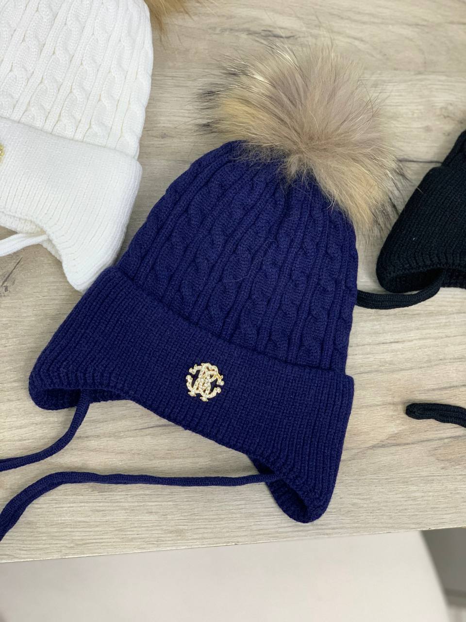 Шапка Roberto Cavalli LUX-78834 представляет собой стильный зимний аксессуар. Выполнена в темно-синем цвете с текстурой вязки косичками. Шапка декорирована меховым помпоном и золотистой эмблемой бренда.