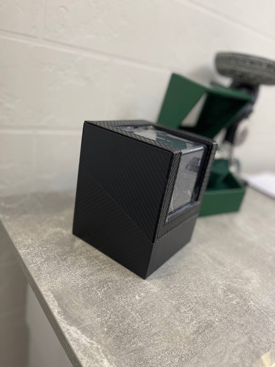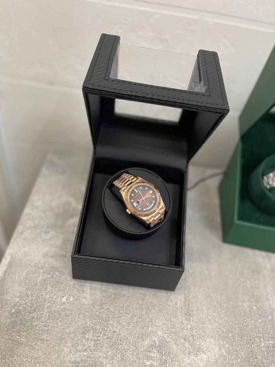 Бокс для часов с автоподзаводом Rolex LUX-101476 — элегантный аксессуар для хранения и поддержания работы часов. Он выполнен в классическом стиле и имеет сдержанный дизайн, который отлично впишется в любой интерьер. Корпус бокса, представленный на фото, выполнен в черном цвете с текстурой под карбон.