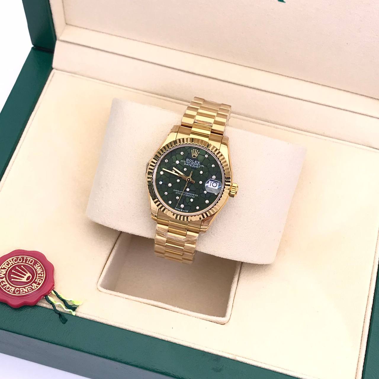 Часы Rolex LUX-78671 представляют собой элегантный аксессуар, выполненный в классическом стиле. Золотистый цвет корпуса и браслета гармонично сочетается с тёмно-зелёным циферблатом, инкрустированным камнями. Часы предназначены для повседневной носки и подчеркивают статус владельца.