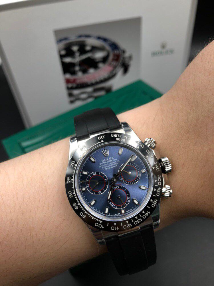 Данный товар представляет собой мужские часы Rolex LUX-14412, выполненные в классическом спортивном стиле. Синий циферблат с тремя дополнительными циферблатами и тахиметрической шкалой по ободку придает им элегантный и функциональный вид. Браслет из стали и черный ремешок обеспечивают комфортное ношение.
