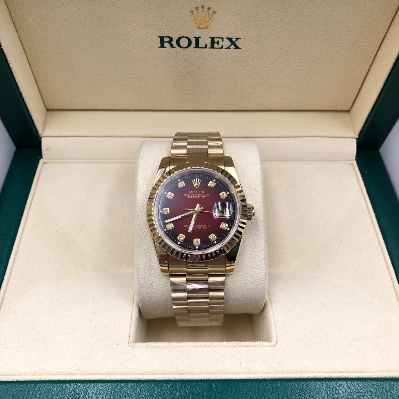 Элегантные женские часы Rolex LUX-11380 в золотом исполнении с темно-бордовым циферблатом, украшенным бриллиантами. Эти часы представляют собой идеальное сочетание роскоши и функциональности, подчеркивая изысканный вкус владелицы. Стильный дизайн делает их подходящими как для повседневного ношения, так и для особых случаев.