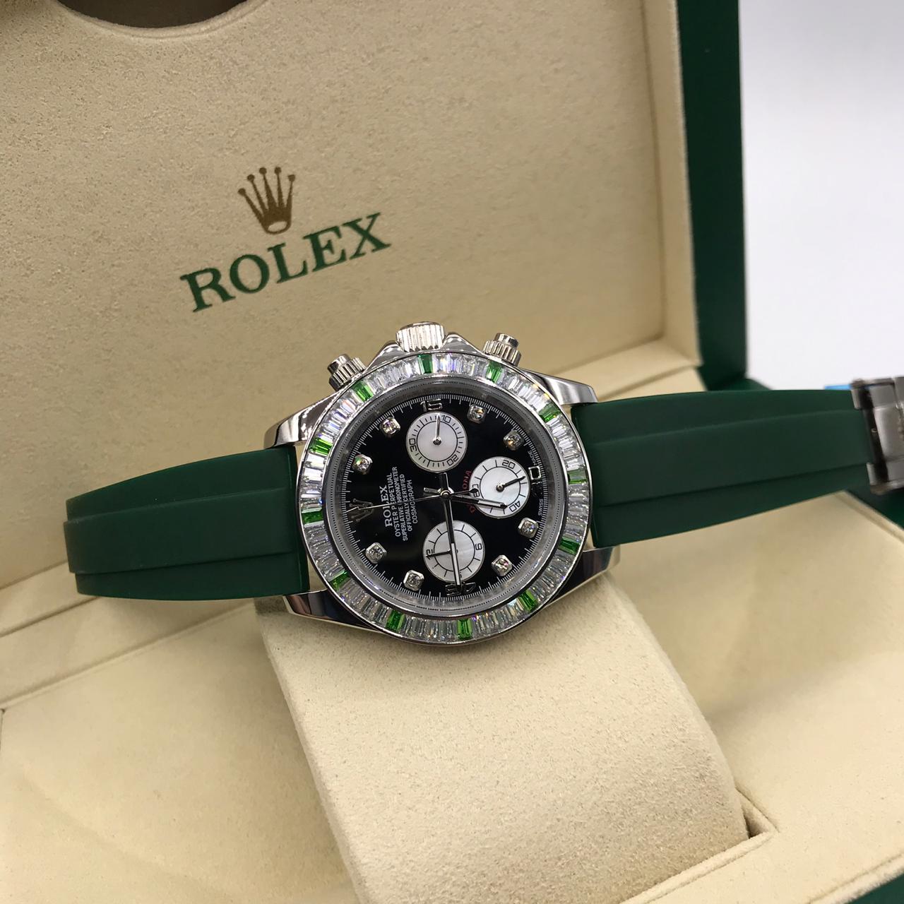 Часы женские Rolex LUX-14547 представляют собой изысканный аксессуар, сочетающий классический дизайн с современными элементами. Этот хронограф дополнен сверкающими кристаллами и зелеными камнями, инкрустированными по ободку, что придает ему особую элегантность. Зеленый каучуковый ремешок обеспечивает комфортное ношение и добавляет спортивный акцент.