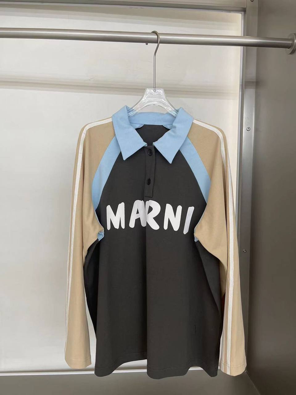 Рубашка LUX-75325 от бренда MARNI представляет собой стильный лонгслив с элементами поло. Цвет изделия сочетает в себе несколько оттенков, включая серый, бежевый и голубой. На груди расположен крупный логотип бренда.