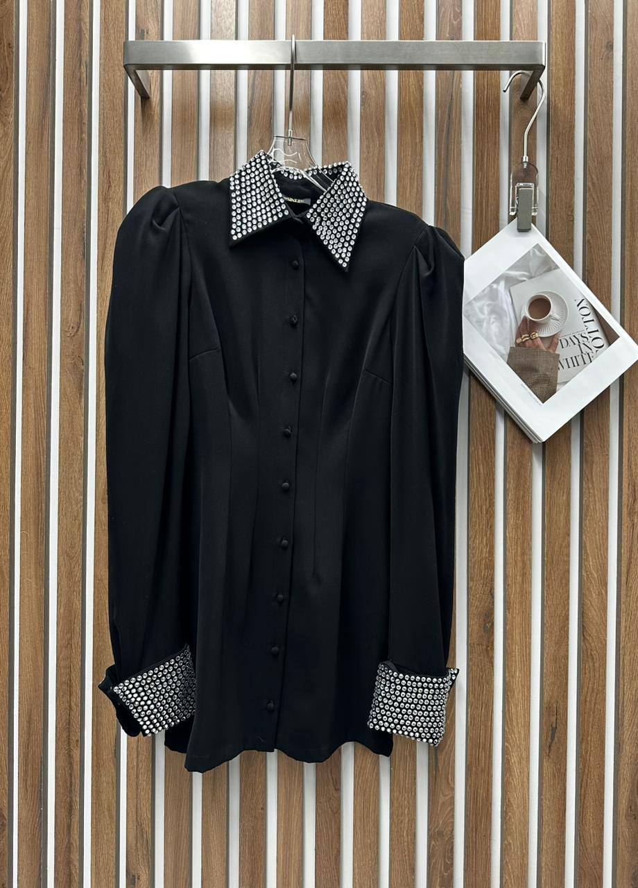 Рубашка LUX-113471 — стильная модель черного цвета, выполненная в классическом стиле. Эта рубашка с длинными рукавами, украшена стразами на воротнике и манжетах, добавляя изысканности и блеска. Идеально подойдет для создания элегантных образов.