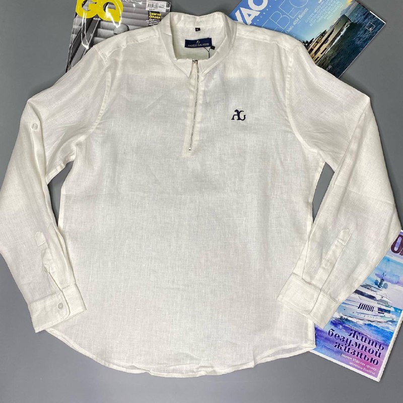 Эта стильная мужская рубашка с длинным рукавом от Angelo Galasso, артикул LUX-50983, выполнена в элегантном минималистичном дизайне. Белый цвет и свободный крой делают ее универсальной для различных образов, от повседневных до более формальных. На груди расположен контрастный логотип бренда, а застежка-молния у воротника-стойки придает современный акцент.