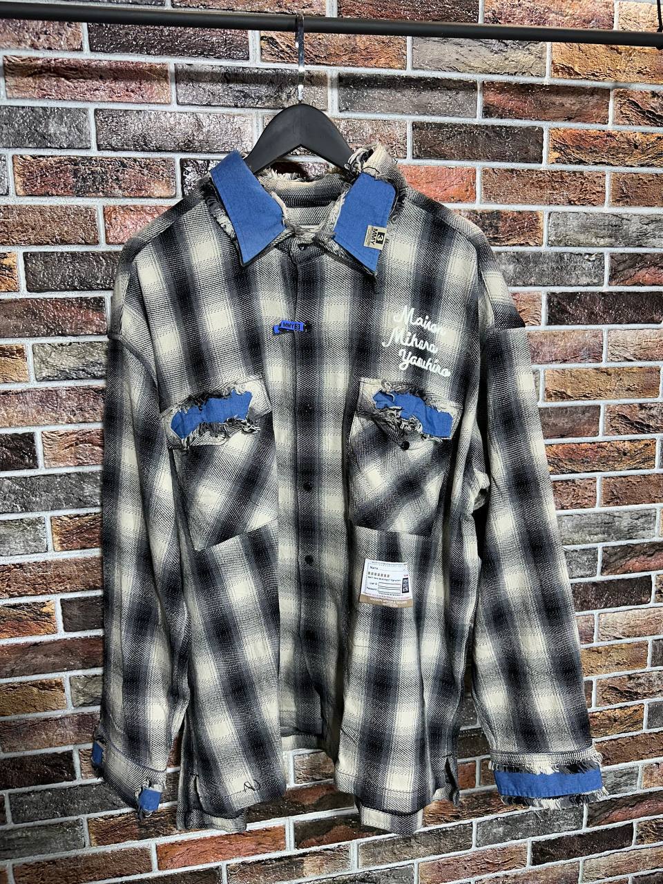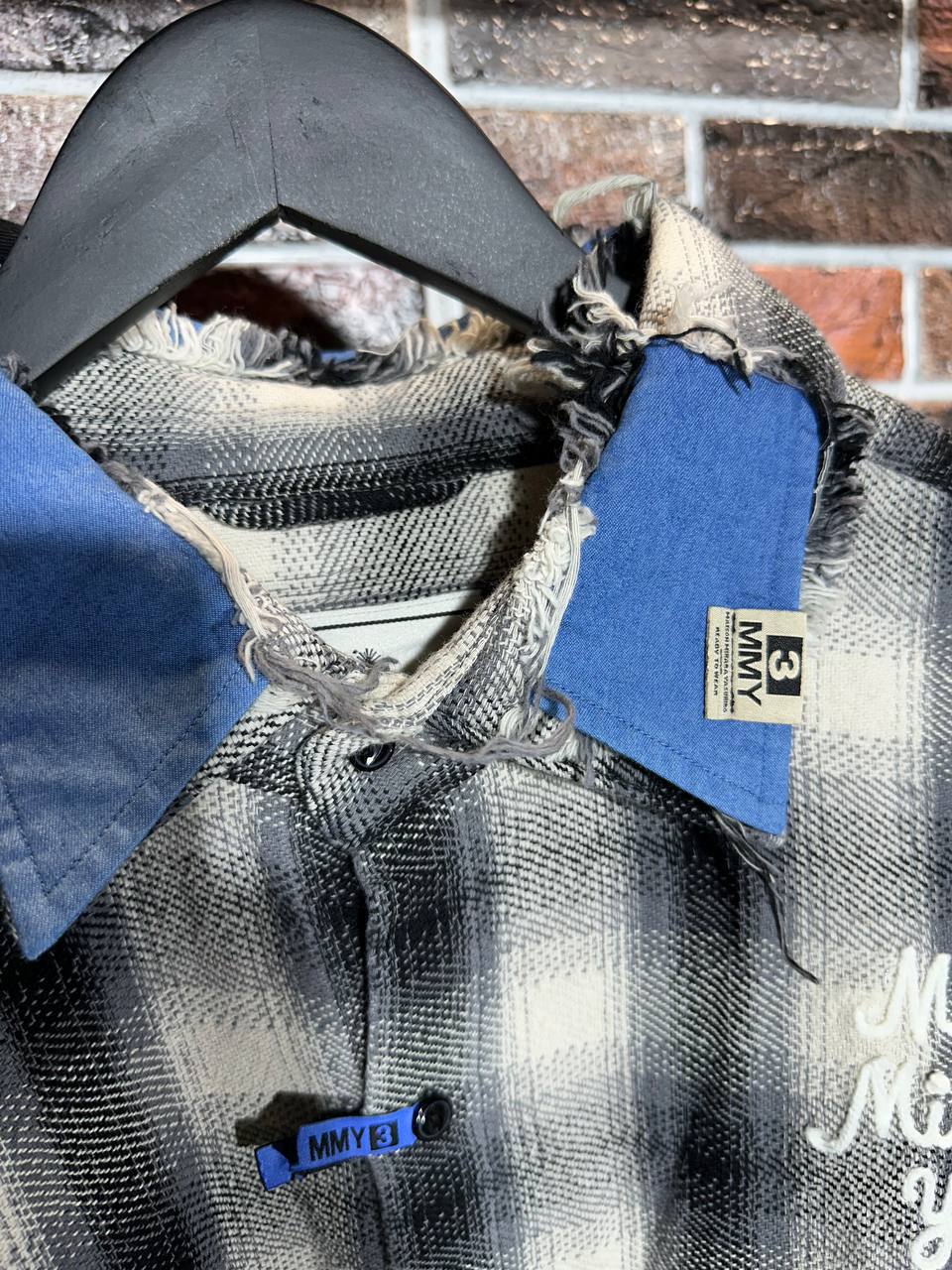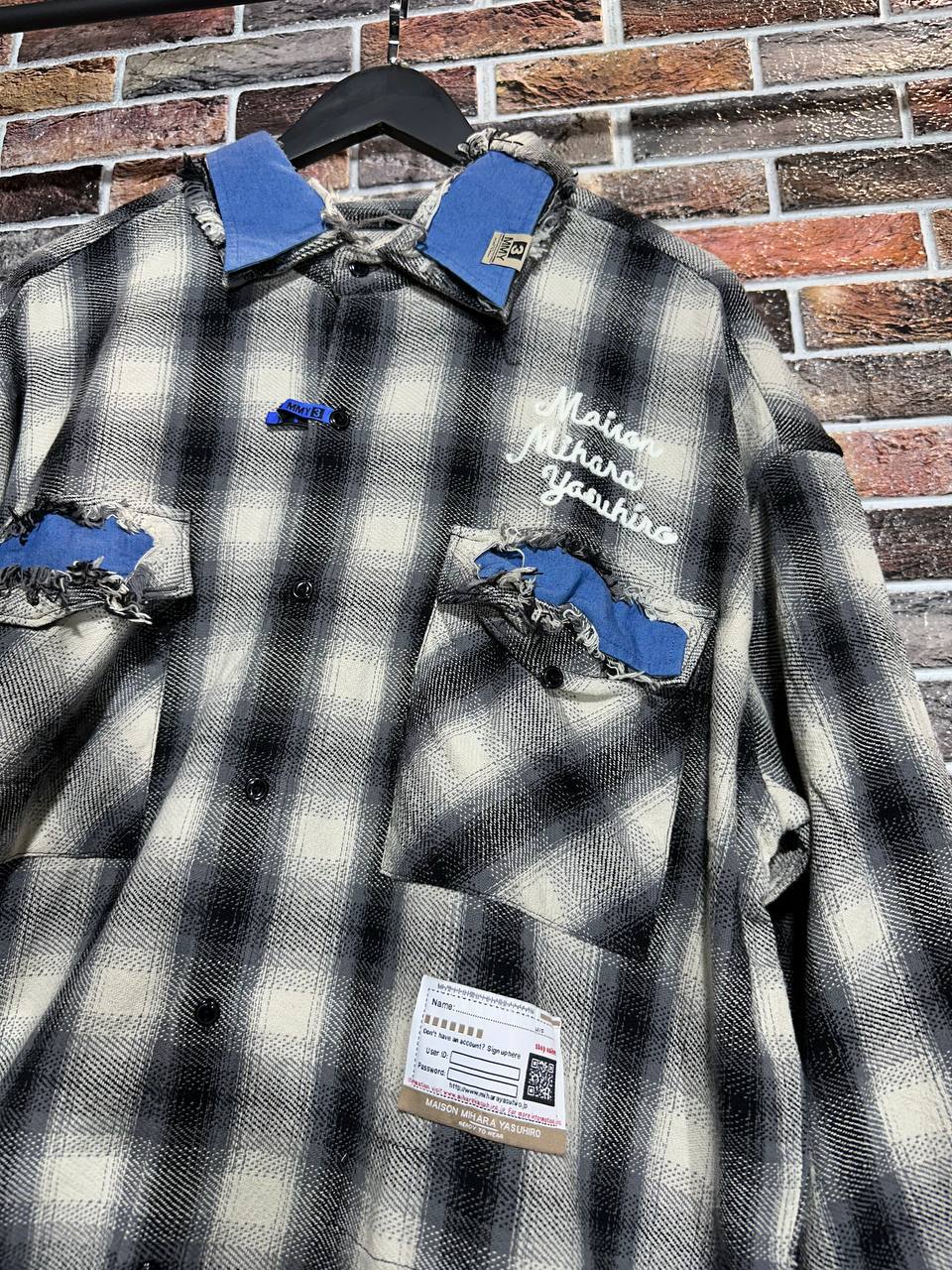 Рубашка MMY OVERSIZE LUX-109090 представляет собой стильную рубашку оверсайз в клетку, выполненную в черно-белых тонах с контрастными синими деталями. Дизайн рубашки включает в себя рваные элементы и надпись, что придает ей современный и дерзкий вид. Идеально подходит для создания повседневных, но выразительных образов.