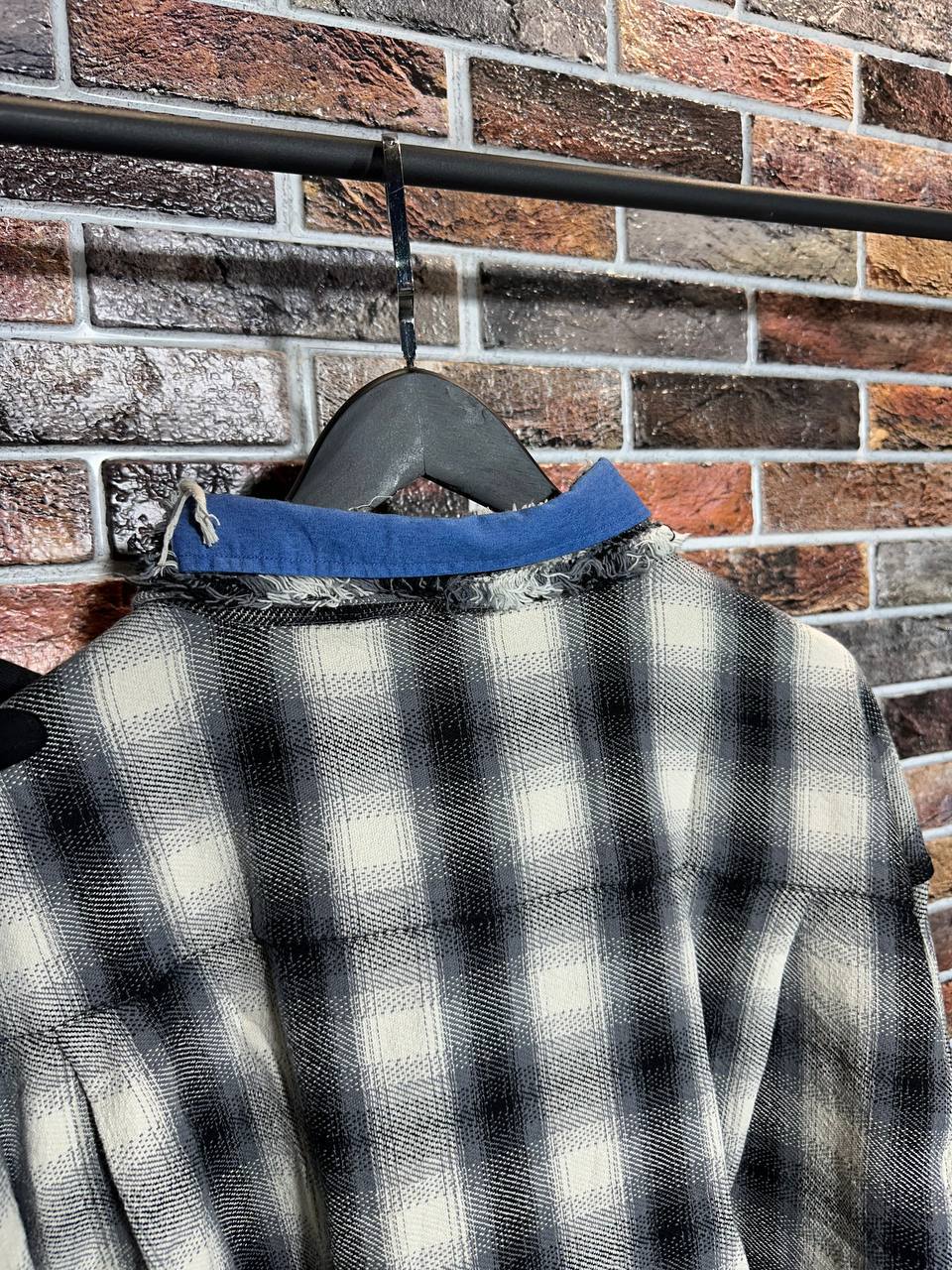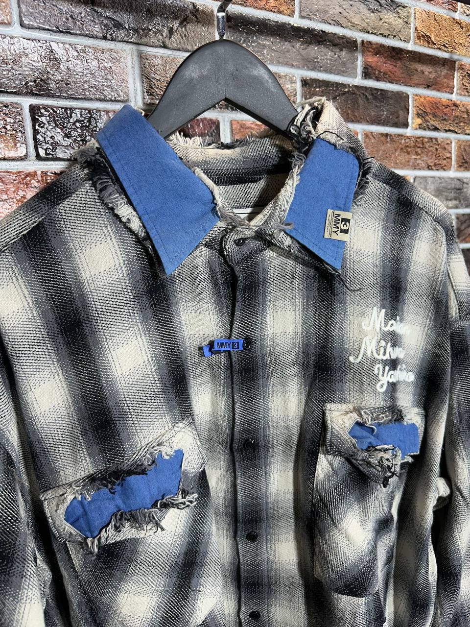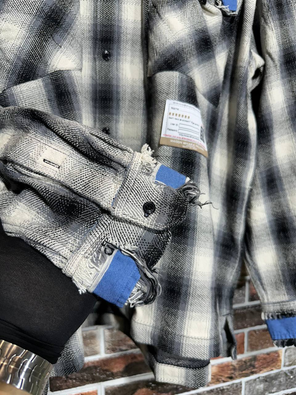 Рубашка MMY OVERSIZE LUX-109090 представляет собой стильную рубашку оверсайз в клетку, выполненную в черно-белых тонах с контрастными синими деталями. Дизайн рубашки включает в себя рваные элементы и надпись, что придает ей современный и дерзкий вид. Идеально подходит для создания повседневных, но выразительных образов.