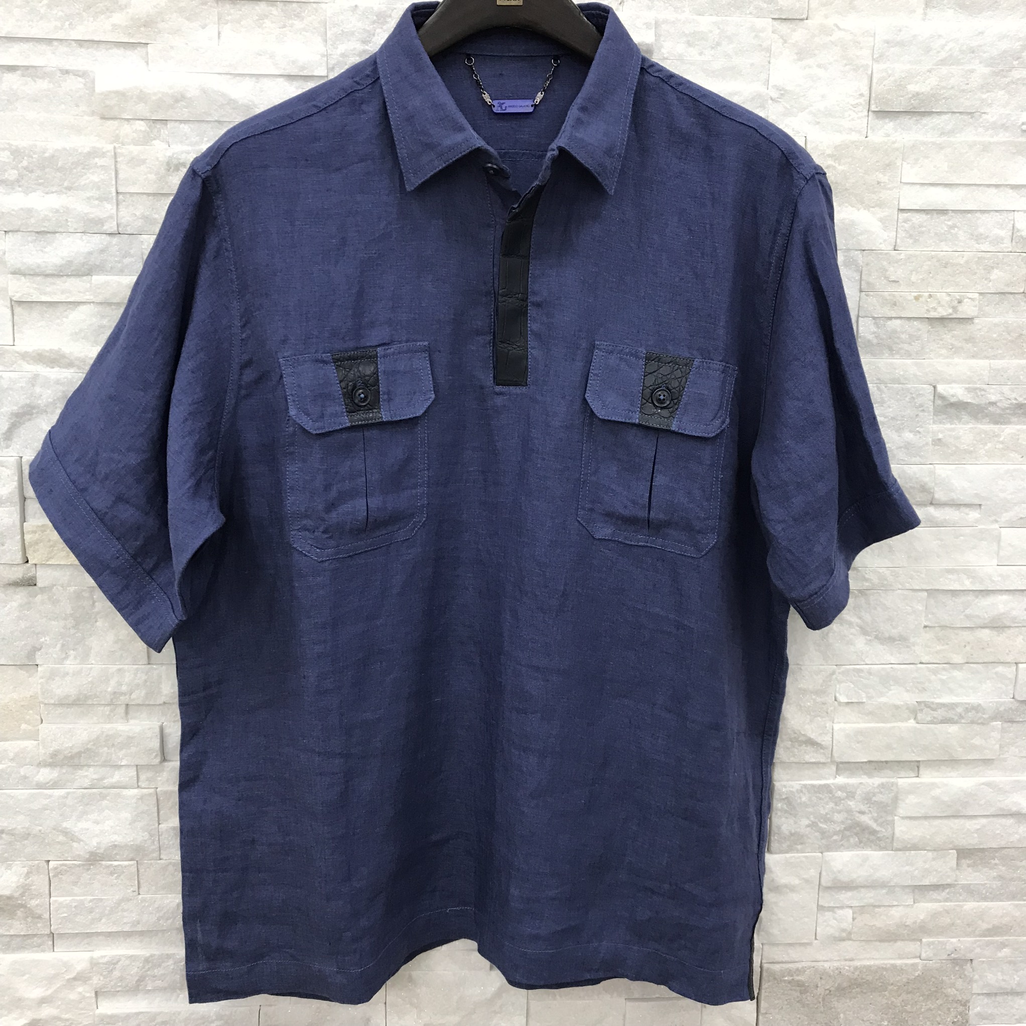Эта стильная мужская рубашка от Angelo Galasso, артикул LUX-16400, выполнена в темно-синем цвете и идеально подходит для создания элегантных образов в стиле casual. Рубашка имеет короткий рукав, отложной воротник и застежку на пуговицах, дополненную декоративными вставками из черной кожи, имитирующей чешую. Два накладных нагрудных кармана с клапанами и пуговицами подчеркивают ее функциональность и добавляют образу завершенность.