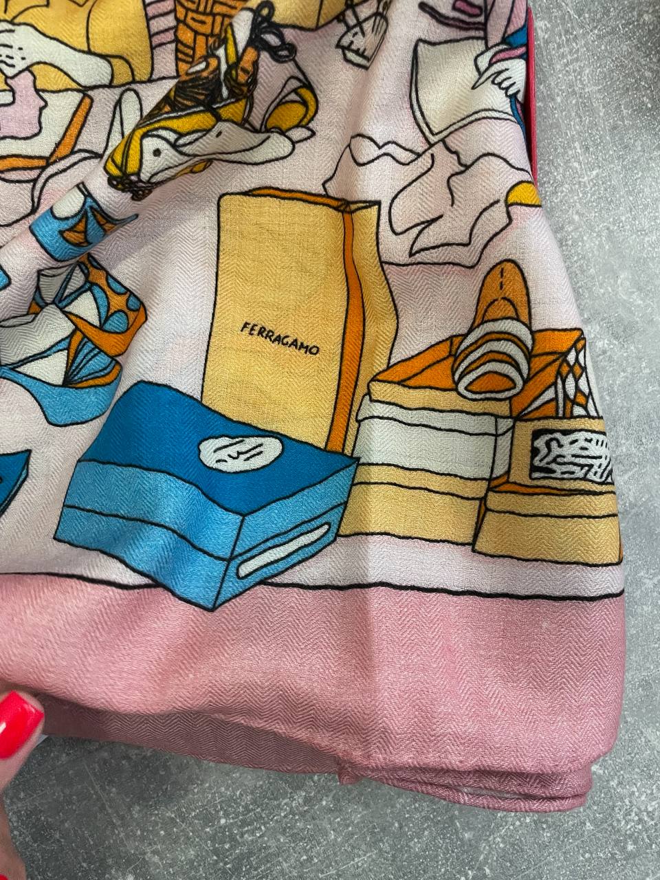 Платок 140*140 Salvatore Ferragamo LUX-110144 представляет собой изысканный аксессуар, сочетающий в себе стиль и элегантность. Этот платок выполнен в нежных пастельных тонах с ярким рисунком, изображающим мастерскую по изготовлению обуви, что делает его уникальным. Идеально подходит для добавления акцента в любой образ.