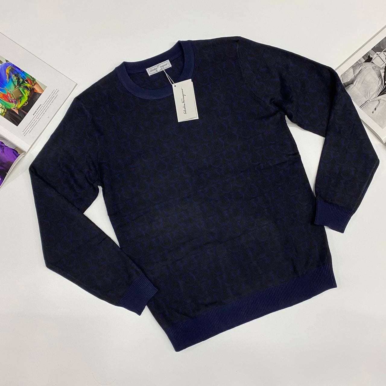 Стильный мужской свитер Salvatore Ferragamo LUX-57089 выполнен в классическом темно-синем цвете с контрастным синим узором. Модель идеально подойдет для создания элегантных повседневных образов.