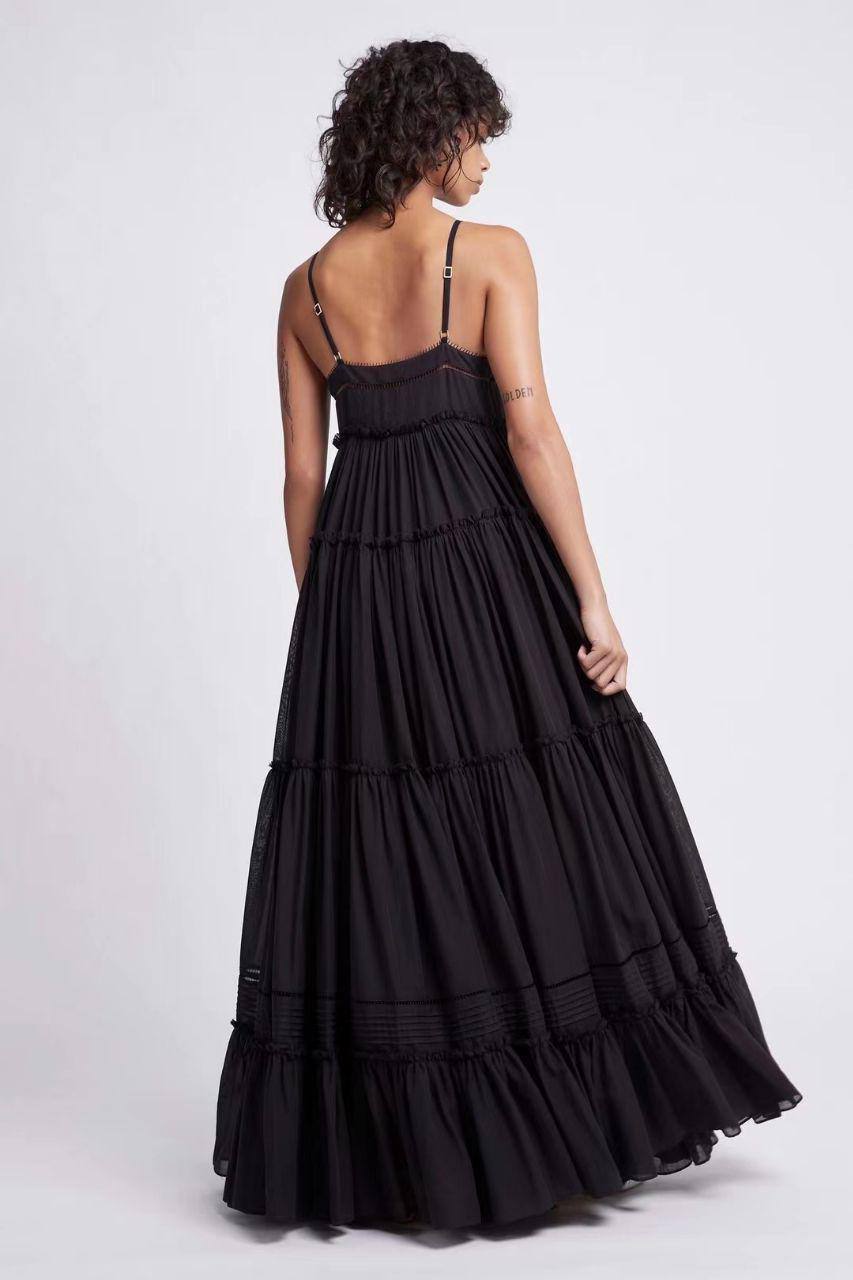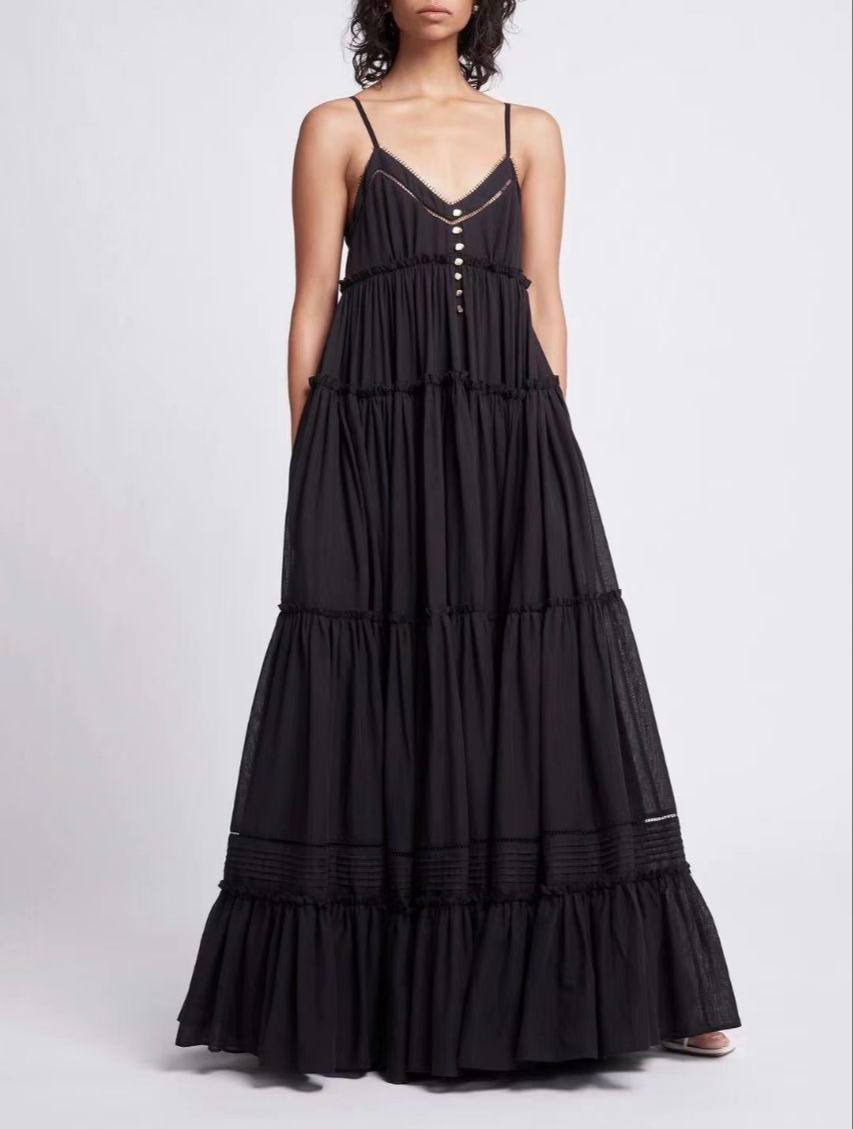 Сарафан LUXE-CRIME 97, представленный на изображении, — это элегантное черное платье в стиле бохо. Сарафан имеет расклешенный силуэт, создающий воздушный и романтичный образ. Идеально подойдет для летнего отдыха, прогулок или вечерних мероприятий.