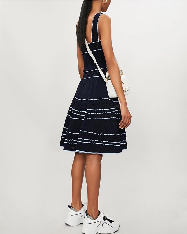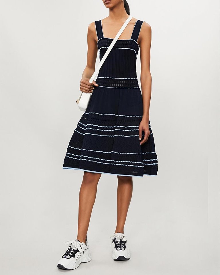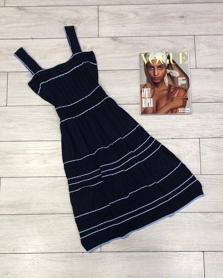Этот темно-синий сарафан Sandro — идеальный выбор для летних образов. Модель средней длины с расклешенной юбкой и тонкими бретелями создает женственный силуэт. Акцентные белые полоски и декоративные отверстия по всей длине добавляют сарафану Sandro LUX-15239 выразительности и изысканности.
