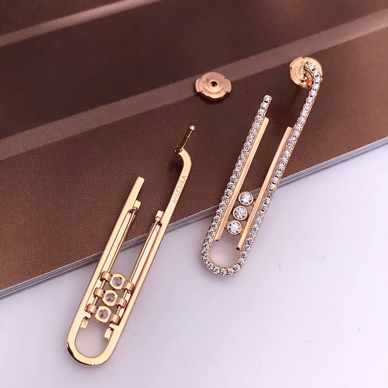 Серьги LUX-77920 от бренда Messika — это элегантное украшение, выполненное в виде булавки. Серьги имеют золотистый оттенок и инкрустированы сверкающими камнями, придавая им изысканный вид. Дизайн сочетает в себе современность и классику, что делает их подходящими для различных образов.