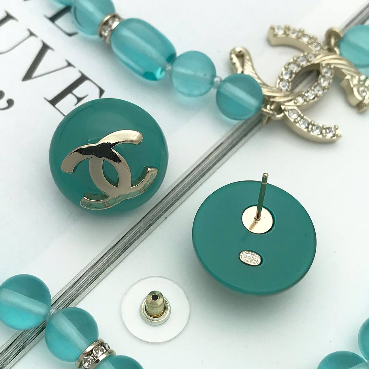 Серьги Chanel LUX-92475 выполнены в классическом стиле. Серьги представляют собой круглые элементы бирюзового цвета с золотистым логотипом бренда. Отлично подойдут для повседневного использования или для особых случаев, добавляя изысканности образу.