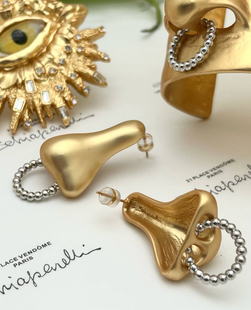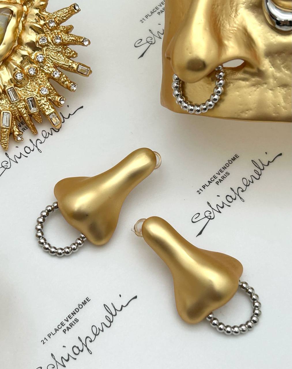 Серьги Schiaparelli LUX-116770 представляют собой оригинальное украшение в виде носа с кольцом. Серьги выполнены в золотистом цвете с деталями серебристого оттенка. Аксессуар подойдет для создания ярких и запоминающихся образов.