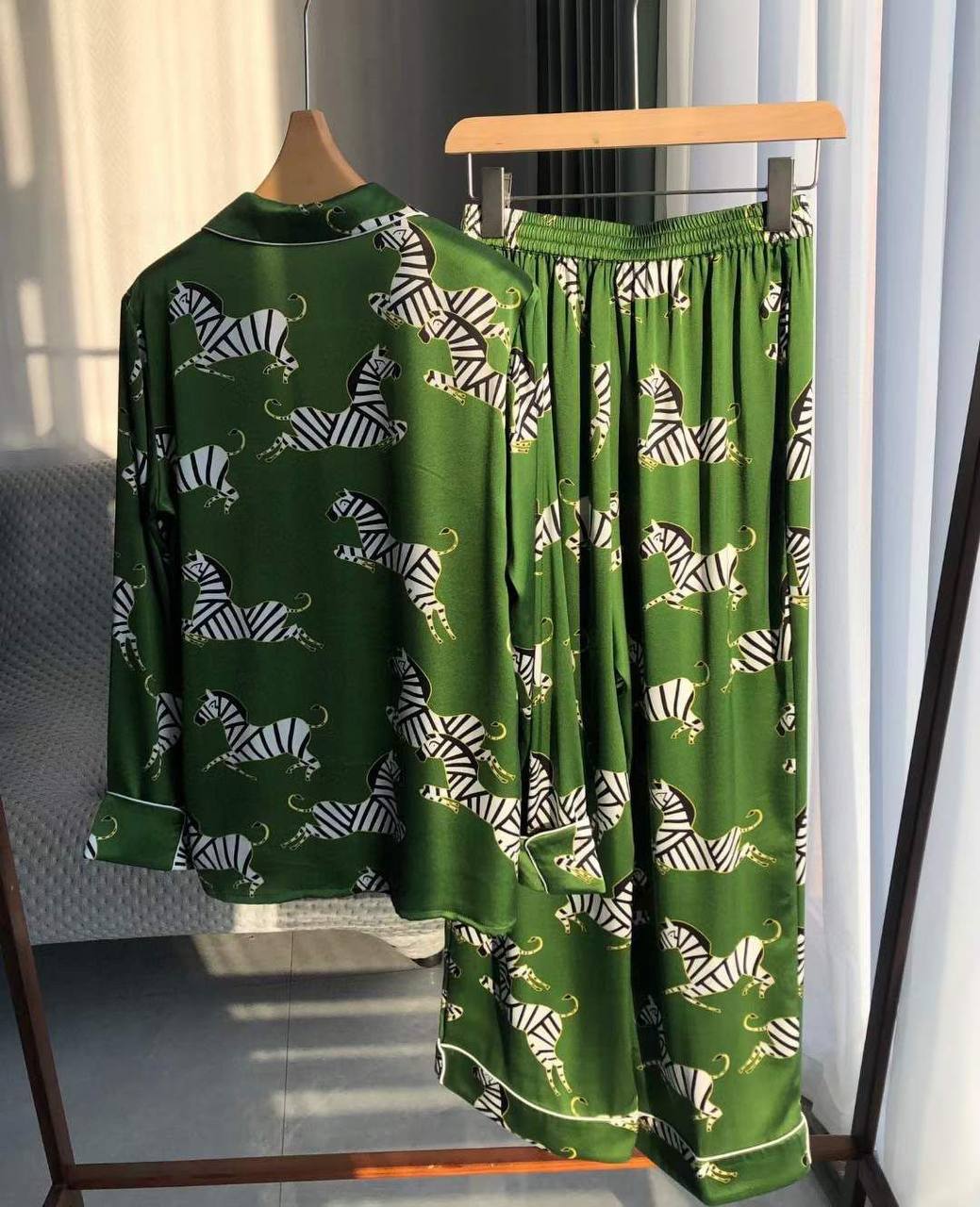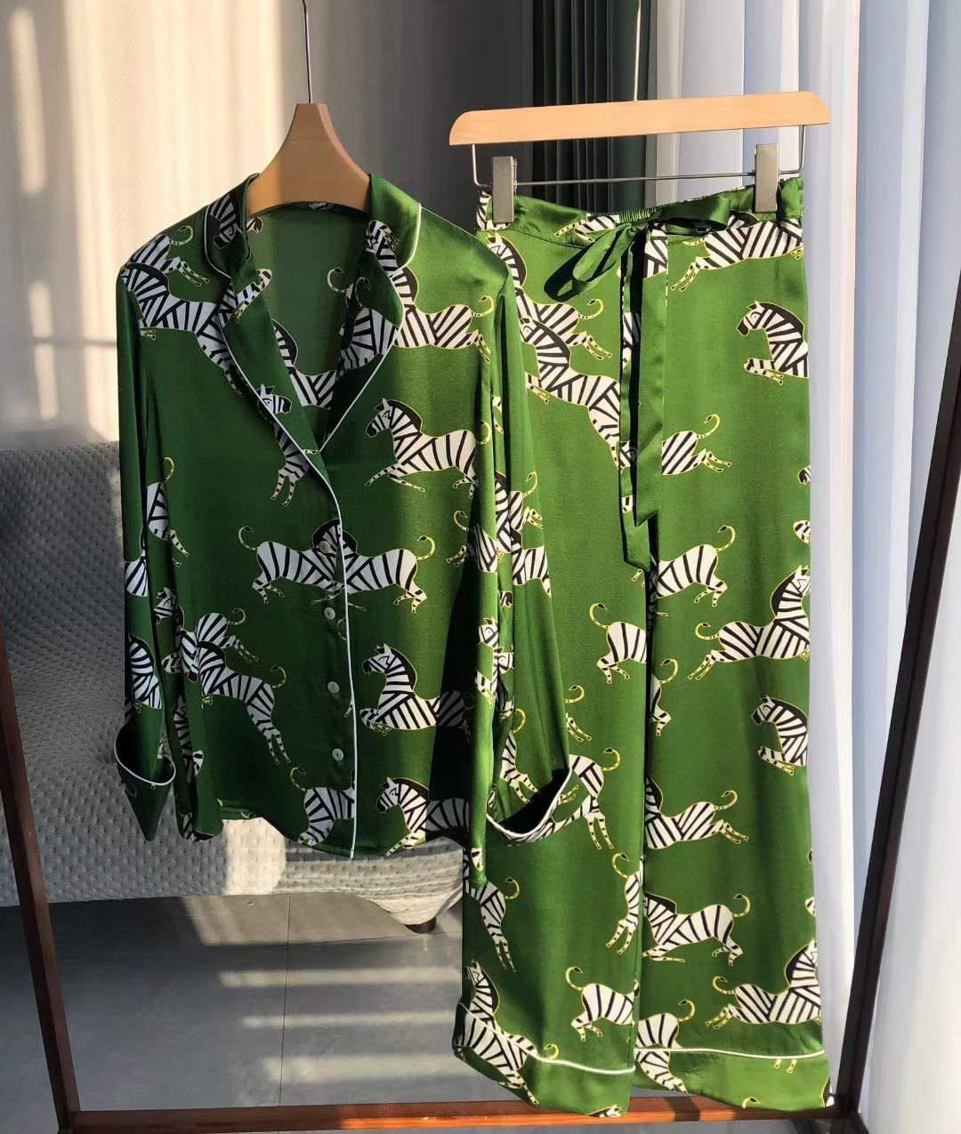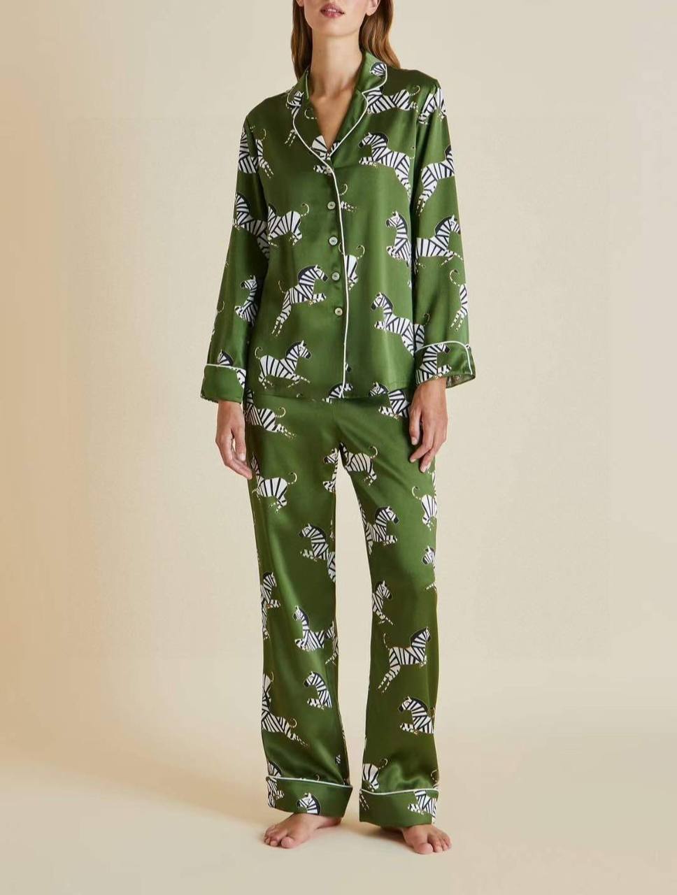 Шёлковый костюм LUX-90049 — это элегантный предмет гардероба, выполненный в стиле пижамы. Костюм имеет оливково-зеленый цвет с принтом зебры. Мягкая текстура ткани обеспечивает приятные тактильные ощущения.