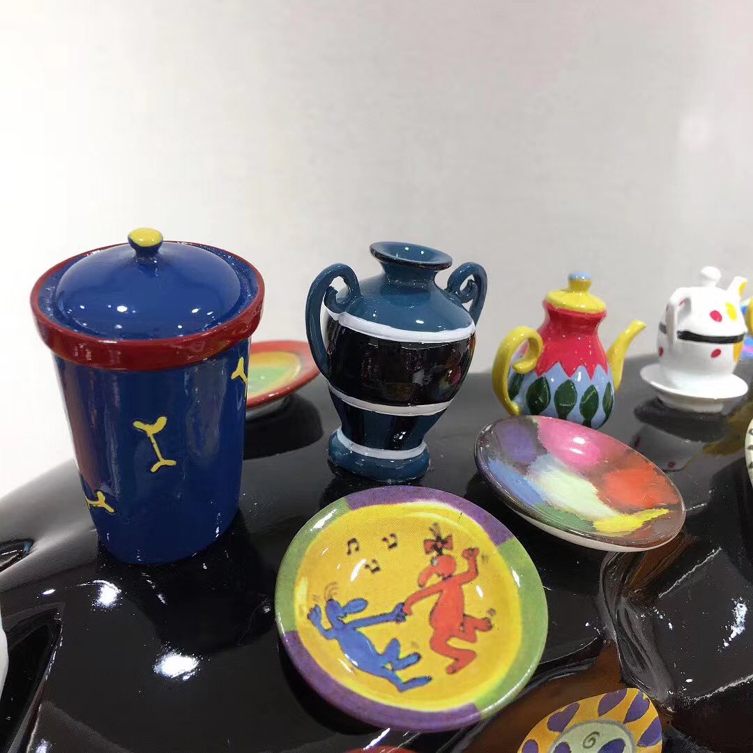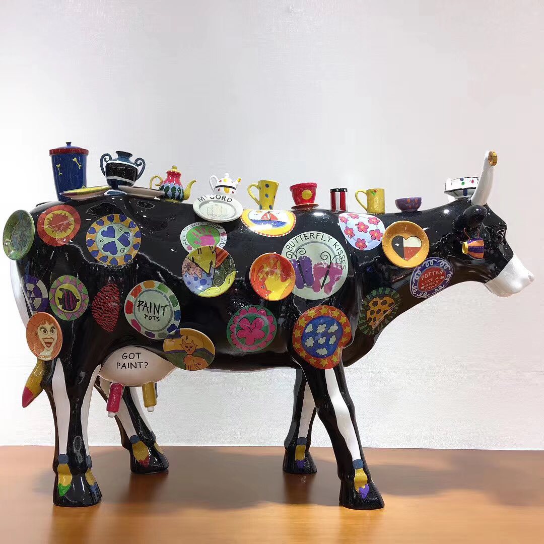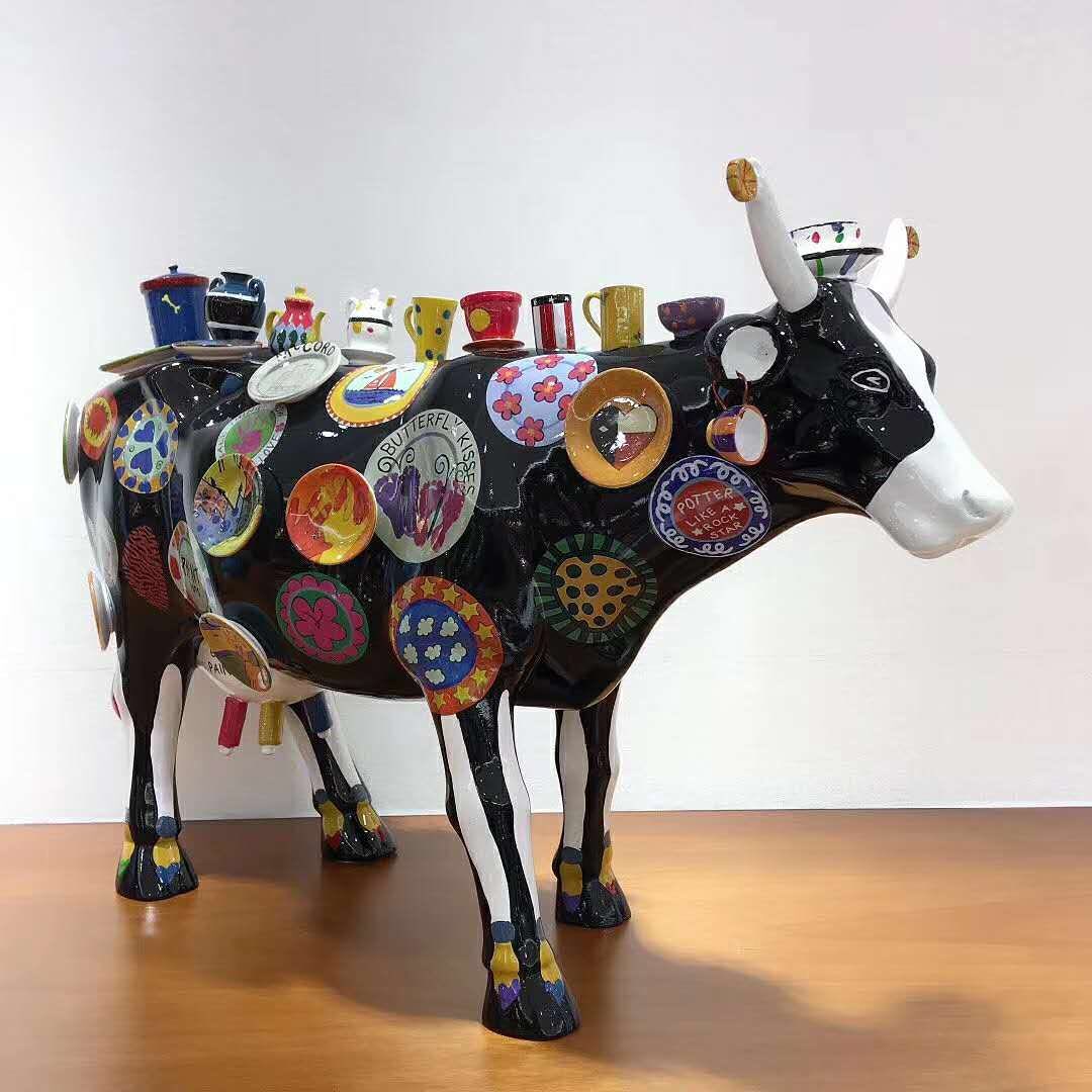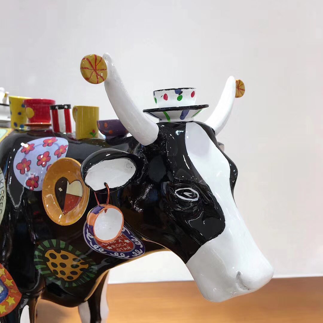 Эта яркая статуэтка в виде коровы, декорированная миниатюрными предметами посуды и тарелками с различными узорами и надписями, станет оригинальным акцентом в интерьере. Статуэтка выполнена в стиле поп-арт, что делает ее выразительным арт-объектом. Яркое оформление и необычный дизайн привлекут внимание и добавят индивидуальности любому пространству.