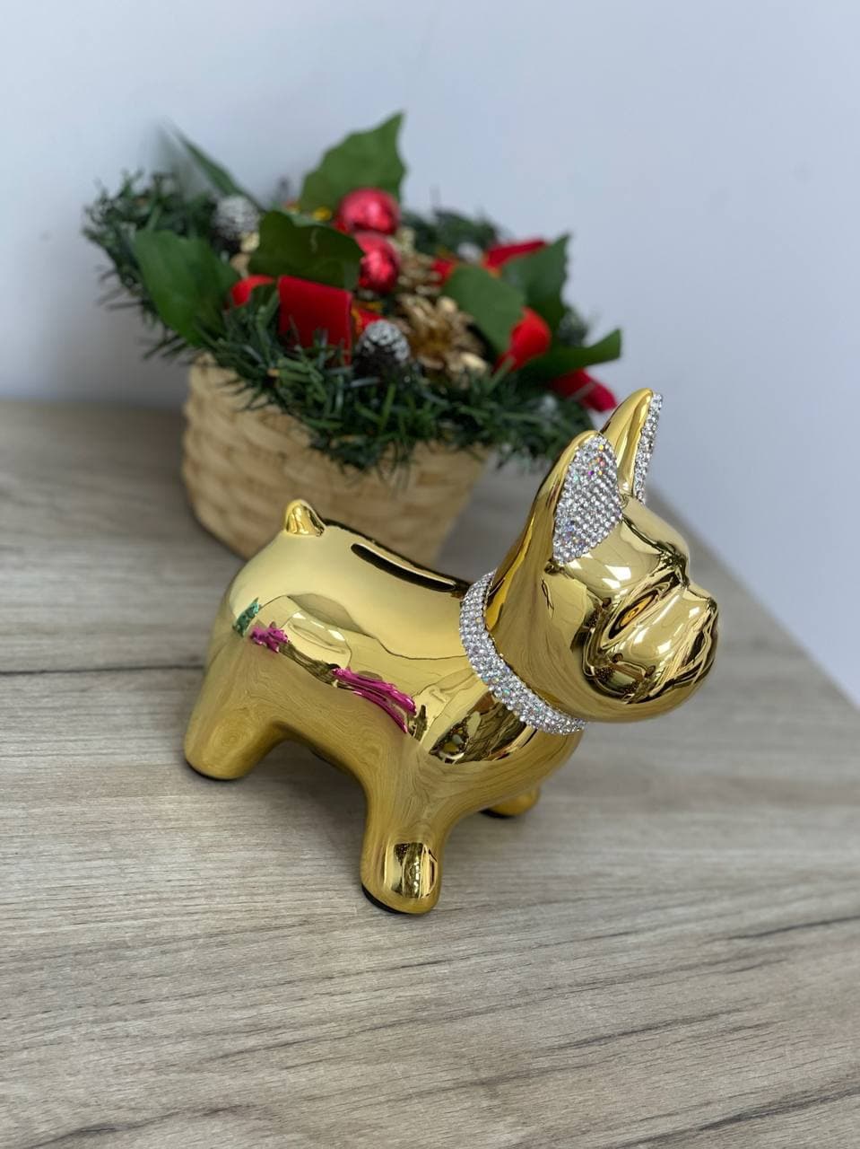 Эта изящная копилка в форме французского бульдога от LUX-CRIME станет стильным аксессуаром для вашего дома. Ее блестящее золотое покрытие и украшение стразами придают ей роскошный вид. Изделие сочетает в себе функциональность копилки и декоративный элемент, идеально вписываясь в современные интерьерные решения.