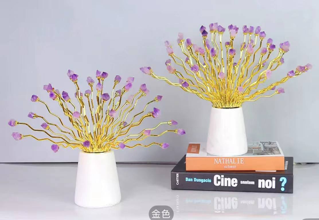 Статуэтка LUX-104600 представляет собой изысканное украшение для интерьера, сочетающее в себе современный дизайн и элементы природной красоты. Фигурка выполнена в виде композиции из золотистых стеблей, увенчанных кристаллами. Она выглядит стильно и элегантно, прекрасно вписываясь в различные интерьерные решения.