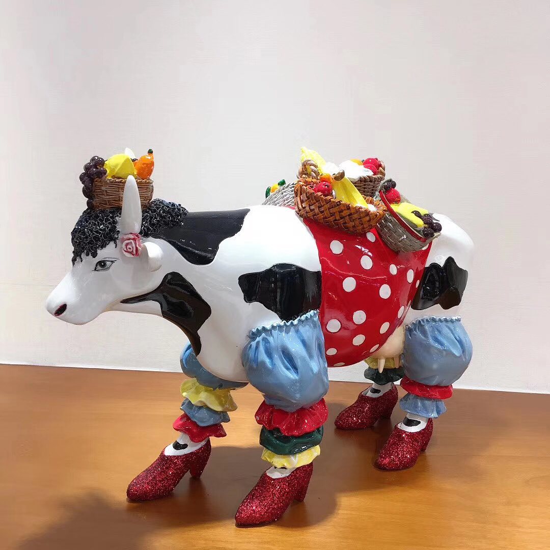 Статуэтка Корова LUX-41587 - это уникальное произведение искусства, выполненное в ярком и эксцентричном стиле, которое привносит элементы игривости и юмора в интерьер. Эта статуэтка, выполненная в виде коровы, украшена корзинами с фруктами на спине и стилизованными штанишками с туфельками на ножках.