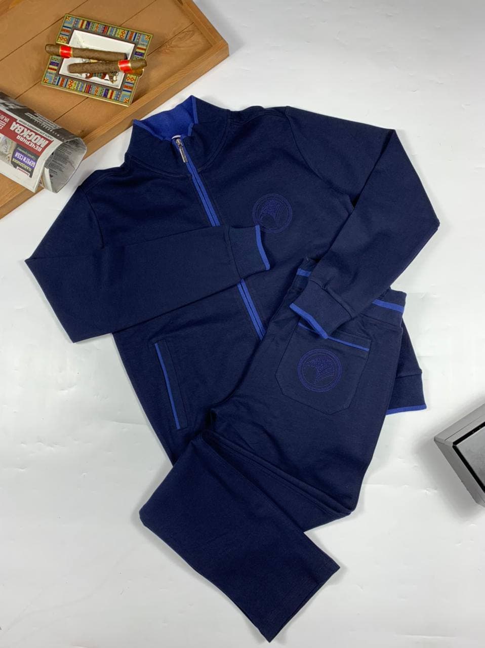 Спортивный костюм Stefano Ricci LUX-53940 представляет собой элегантный и комфортный комплект, выполненный в классическом темно-синем цвете. Стильный дизайн костюма подчеркивается контрастной синей отделкой по воротнику, молнии и манжетам, а также вышитым логотипом бренда на груди и бедре. Он идеально подходит для создания непринужденного, но в то же время изысканного образа.