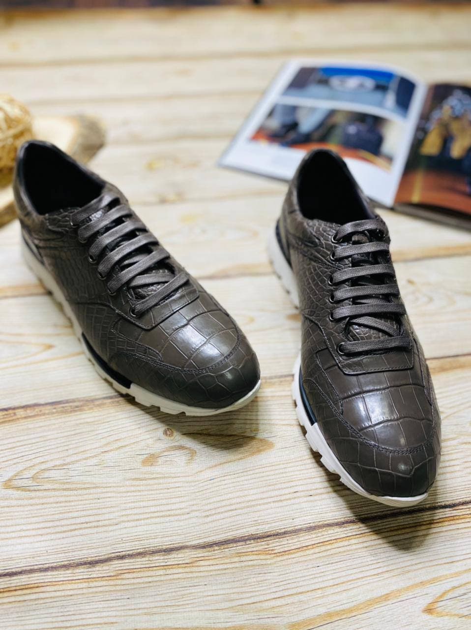Эти мужские кроссовки Stefano Ricci LUX-53801 представляют собой сочетание спортивного стиля и роскошной отделки. Они выполнены в темном оттенке, имитирующем текстуру кожи аллигатора, что придает им элегантный и изысканный вид. Удобная шнуровка обеспечивает надежную фиксацию, а белая подошва добавляет контраст и подчеркивает современный дизайн.