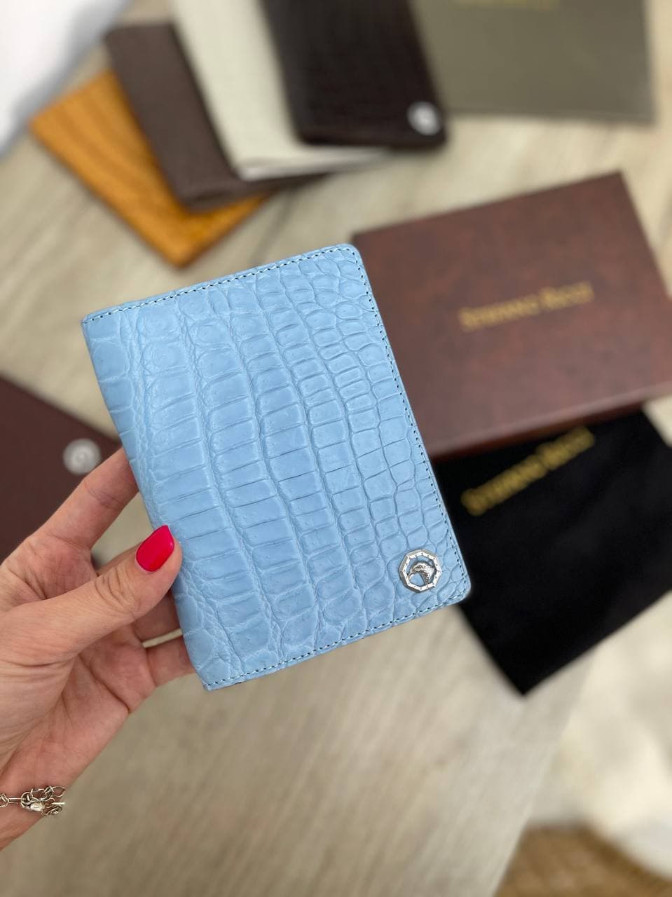 Обложка на паспорт Stefano Ricci LUX-60761 выполнена в нежно-голубом цвете с тиснением под кожу крокодила, придающим изделию роскошный и элегантный вид. Этот аксессуар от Stefano Ricci идеально подойдет для ценителей изысканных деталей и высокого качества.