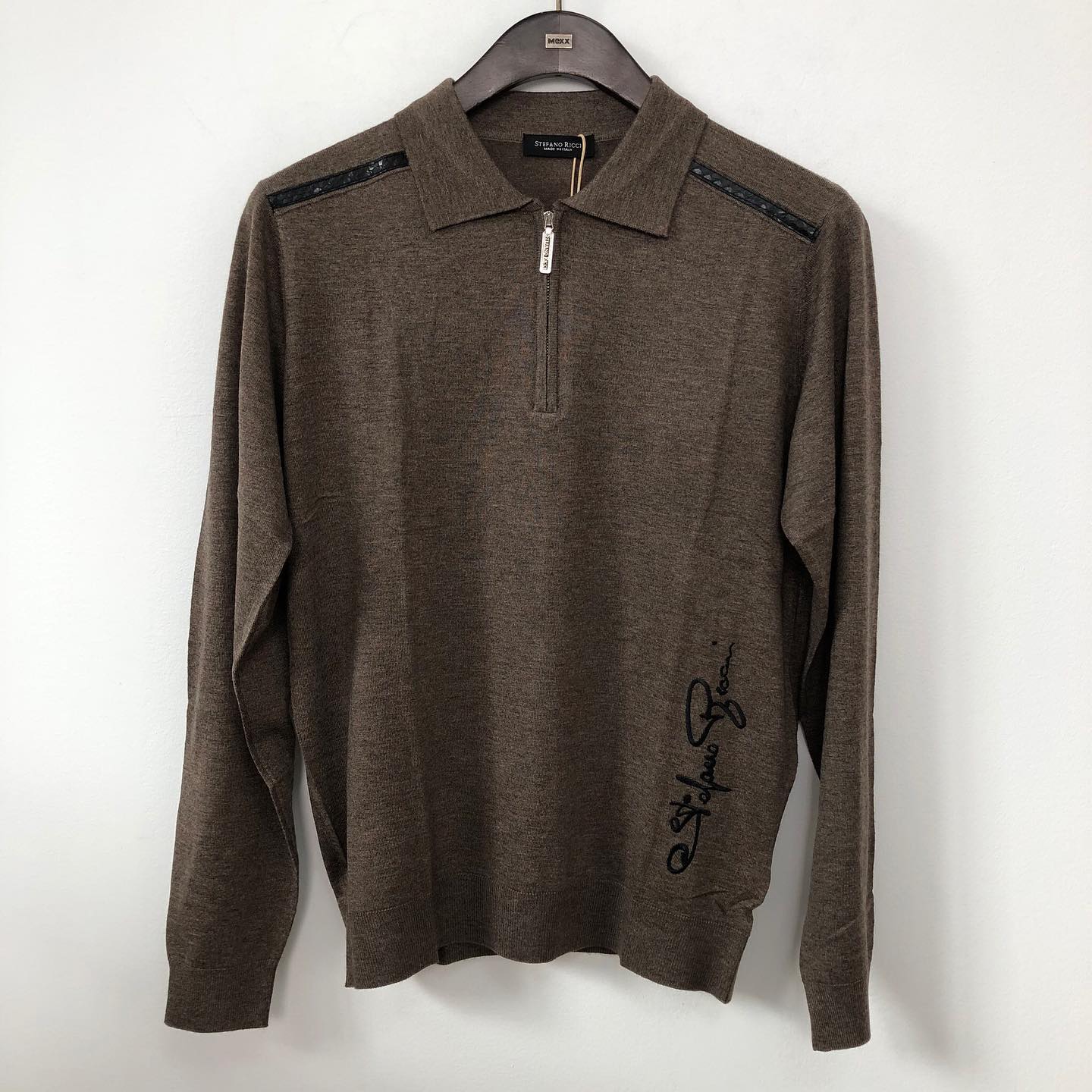 Это мужское поло от Stefano Ricci, выполненное в элегантном стиле. Изделие отличает приглушенный коричневый цвет и детали, такие как молния на воротнике и декоративные вставки на плечах, придающие ему изысканный вид. Отличный выбор для создания стильных повседневных и полуофициальных образов.