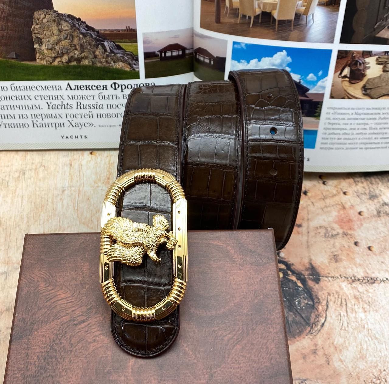 Ремень мужской Stefano Ricci LUX-42859 – это элегантный аксессуар, выполненный в классическом стиле, подчеркивающий статус и изысканный вкус владельца. Ремень изготовлен из высококачественной кожи с тиснением под крокодила, что придает ему роскошный вид. Застежка выполнена в виде массивной пряжки с позолотой и изображением орла – фирменным знаком бренда.