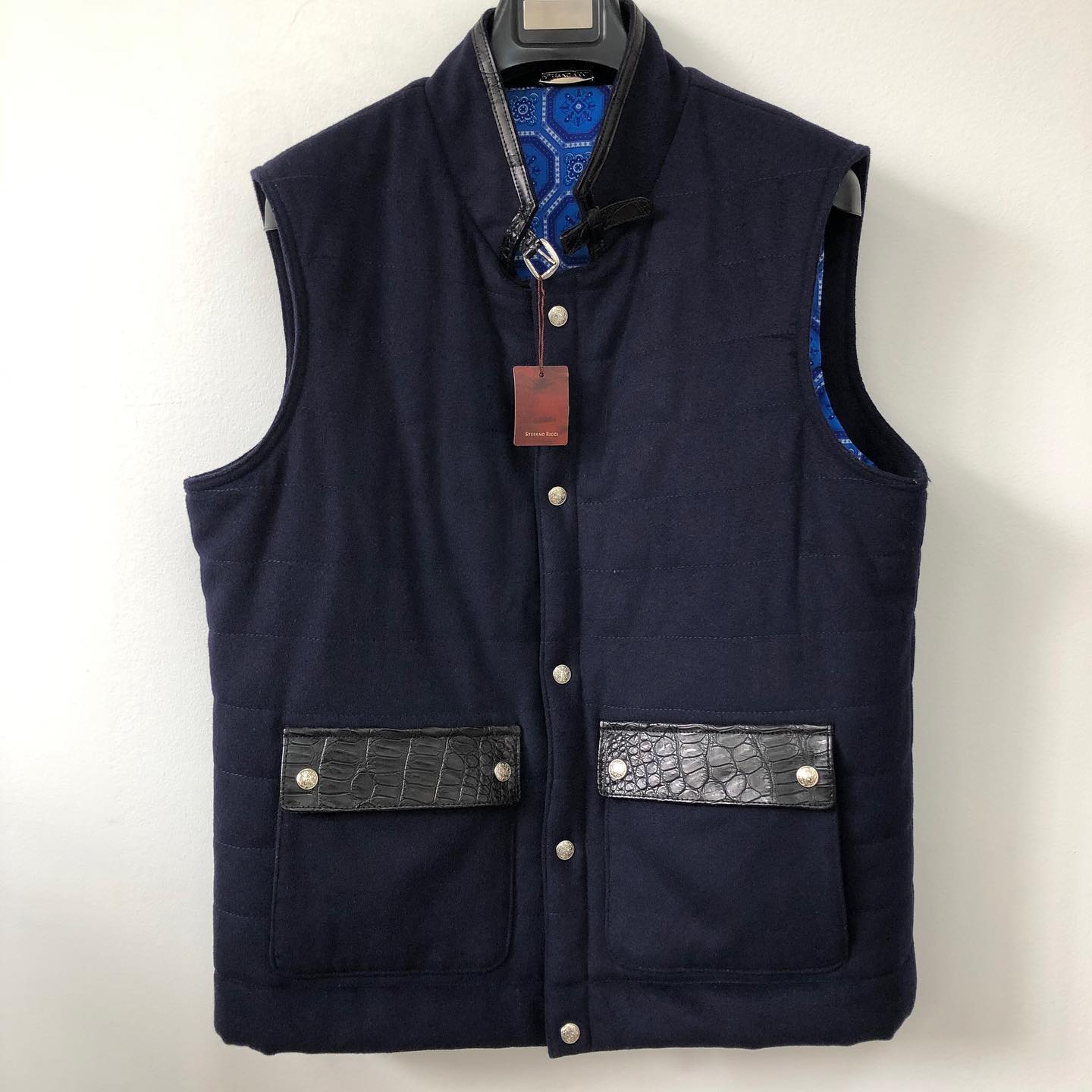 Мужской жилет Stefano Ricci LUX-35128 представляет собой элегантный и стильный предмет гардероба, выполненный в темно-синем цвете. Дизайн жилета подчеркнут деталями, такими как контрастная отделка карманов из кожи с фактурой рептилии и фирменная фурнитура. Подкладка с оригинальным принтом добавляет изделию индивидуальности. Это отличное решение для создания многослойных образов в прохладное время года.