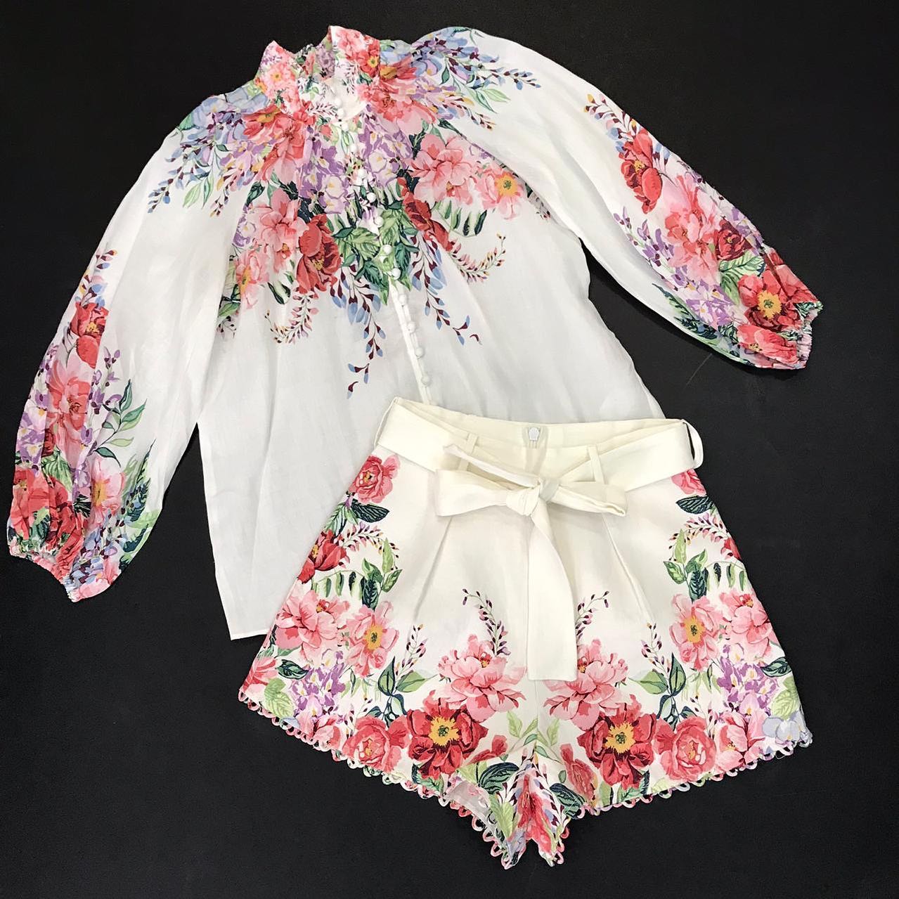 Этот женский костюм, состоящий из блузы и шорт, выполнен в элегантном и романтичном стиле. Яркий цветочный принт, украшающий как верх, так и низ комплекта, придает образу свежесть и женственность. Высокий воротник блузы и пояс-бант на шортах добавляют изысканности. Этот комплект идеально подойдет для создания стильных летних образов.