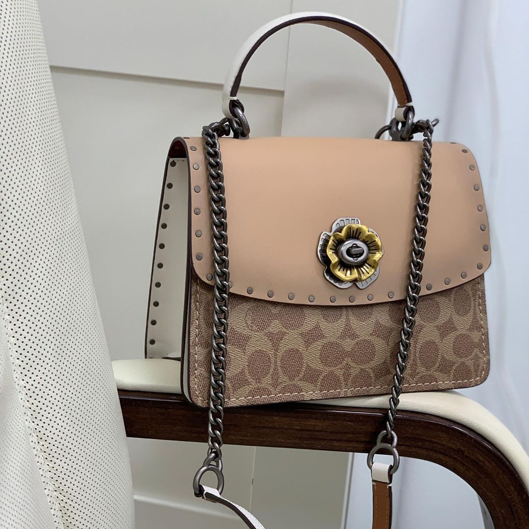 Эта женская сумка LUX-15488 от бренда COACH — стильный аксессуар, сочетающий классический дизайн с современными деталями. Сумка выполнена в бежевых тонах с контрастной белой отделкой и украшена фирменным монограммным принтом. Элегантный декоративный элемент в виде цветка на клапане придает изделию особую изысканность. Практичный размер и удобный ремень-цепочка делают эту модель идеальной для повседневного использования.