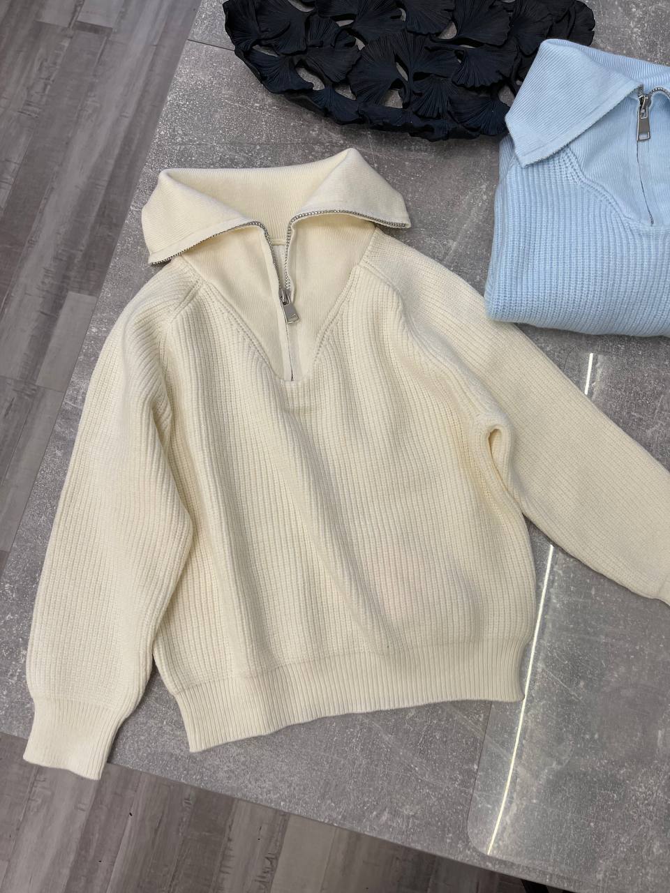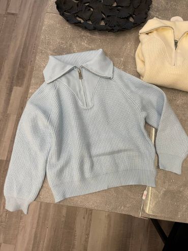 Свитер LUX-97128 - это стильный свитер, выполненный в современном дизайне. Он представлен в кремовом оттенке и имеет воротник-стойку, который трансформируется в отложной воротник с молнией. Текстура свитера – крупная вязка. Идеален для создания повседневных образов.