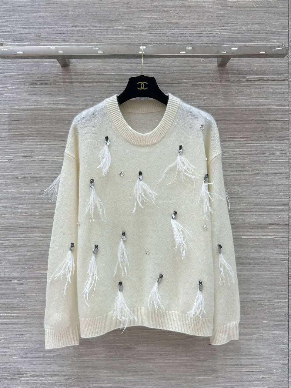 Свитер LUX-112998 - это изысканный элемент гардероба. Свитер выполнен в кремовом цвете, украшен декором из перьев и страз. Этот свитер придаст вашему образу женственность и элегантность, подходящий для создания как повседневных, так и вечерних нарядов.