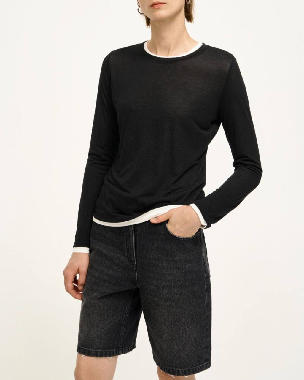 Лонгслив The Row LUX-109148 - это классический лонгслив в минималистичном стиле. Он выполнен в черном цвете с контрастной белой окантовкой по горловине и манжетам. Ткань, вероятно, имеет лёгкую текстуру. Предназначен для повседневного гардероба, хорошо сочетается с различными стилями одежды.
