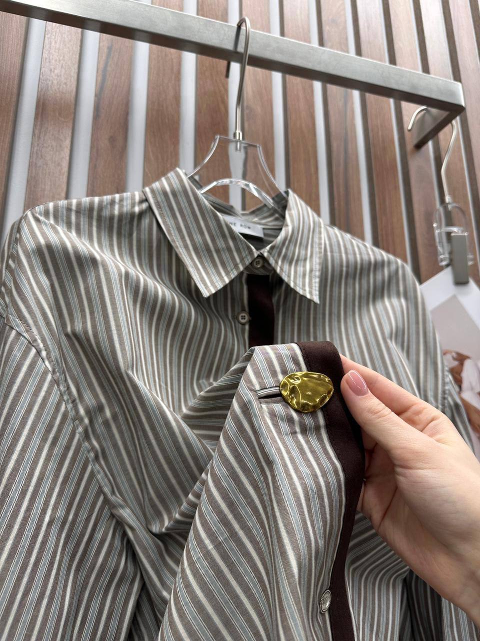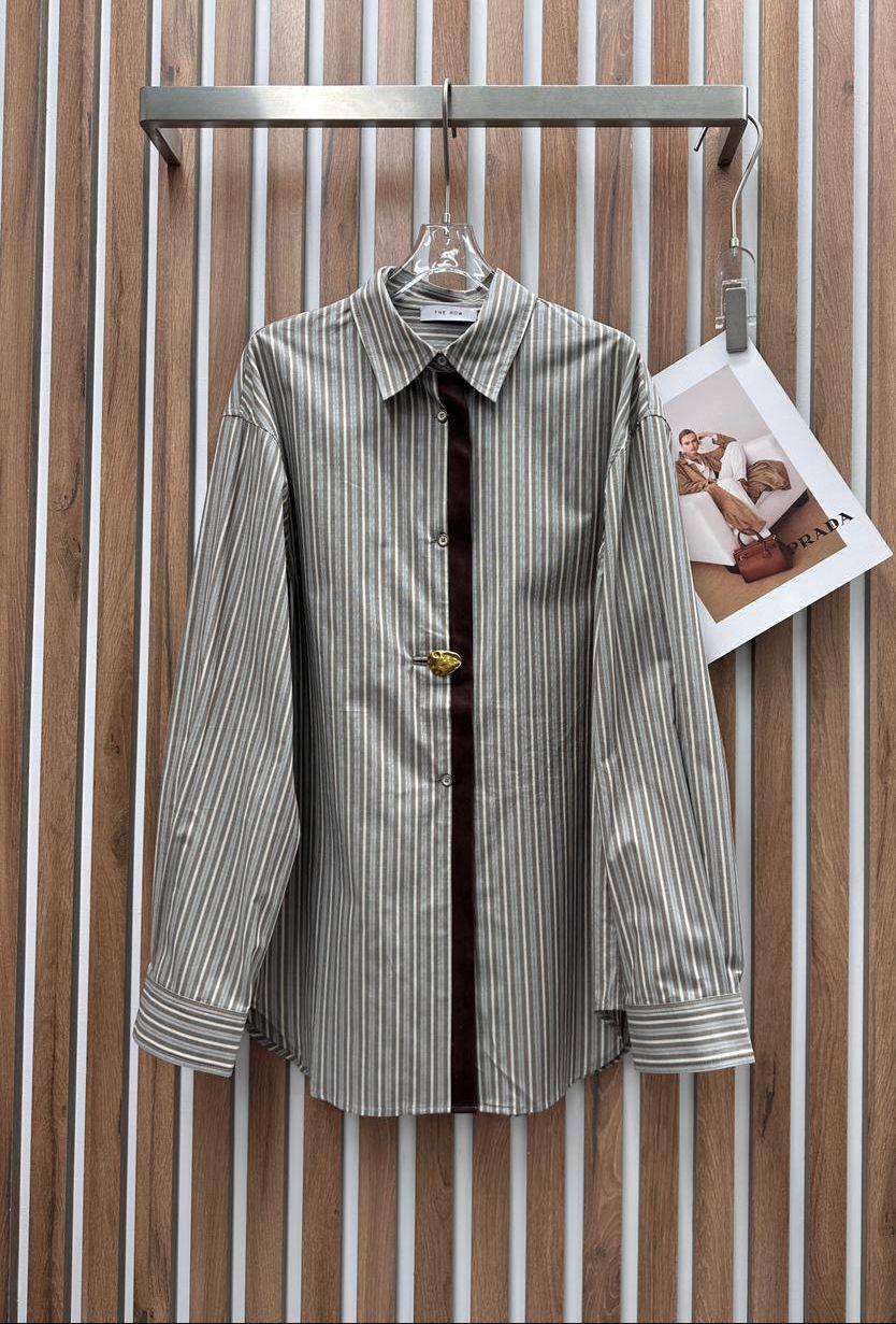 Рубашка The Row LUX-111290 выполнена в классическом стиле. Имеет вертикальную полоску и дополнена контрастной вставкой. Прекрасно подойдет для создания элегантных образов.