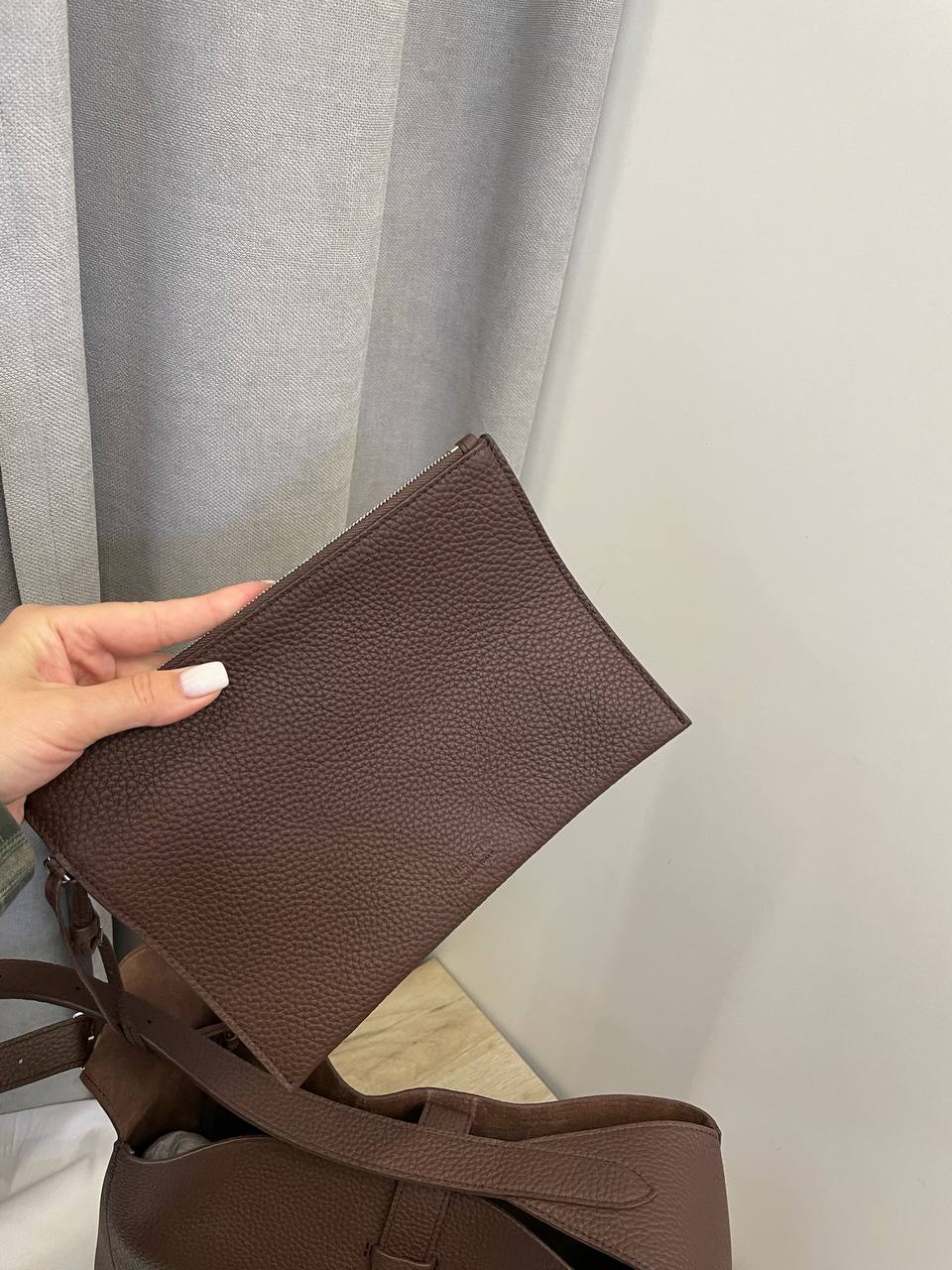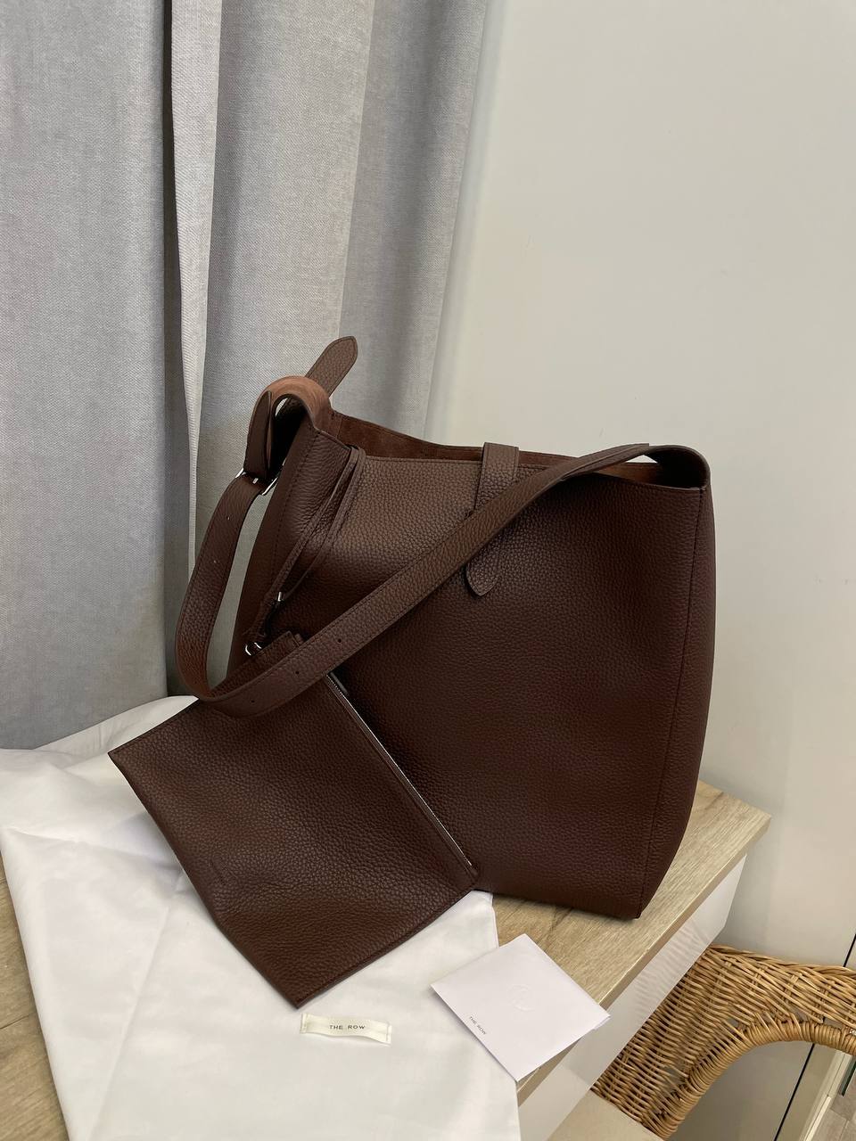 Сумка женская The Row LUX-115684 представляет собой элегантный аксессуар для повседневного использования. Сумка выполнена в коричневом цвете, имеет классический силуэт. Текстура сумки с эффектом зернистой кожи придает ей изысканный вид.