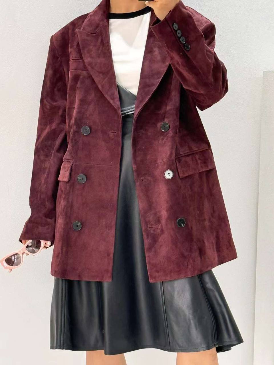 Замшевый жакет The Row LUX-110751 представляет собой элегантный предмет гардероба, который идеально подходит для создания стильного образа. Жакет выполнен в благородном бордовом цвете, имеет текстуру замши и классический крой, что делает его универсальным для различных случаев.