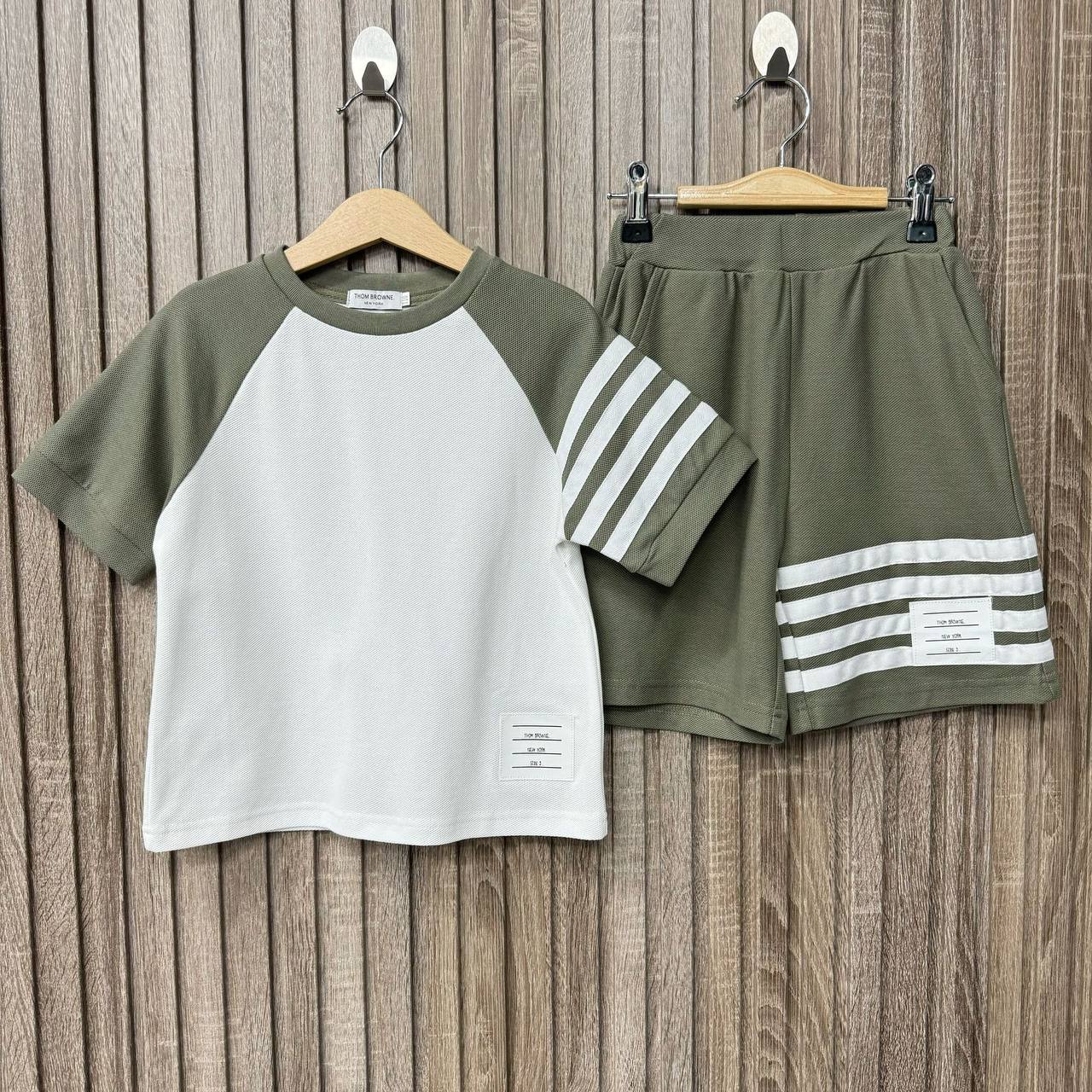 Костюм THOM BROWNE LUX-118810 — это стильный комплект, представленный в виде футболки с шортами. Футболка выполнена в бело-зелёных тонах, шорты - в цвет футболки. Костюм идеально подходит для повседневной носки в летний период.