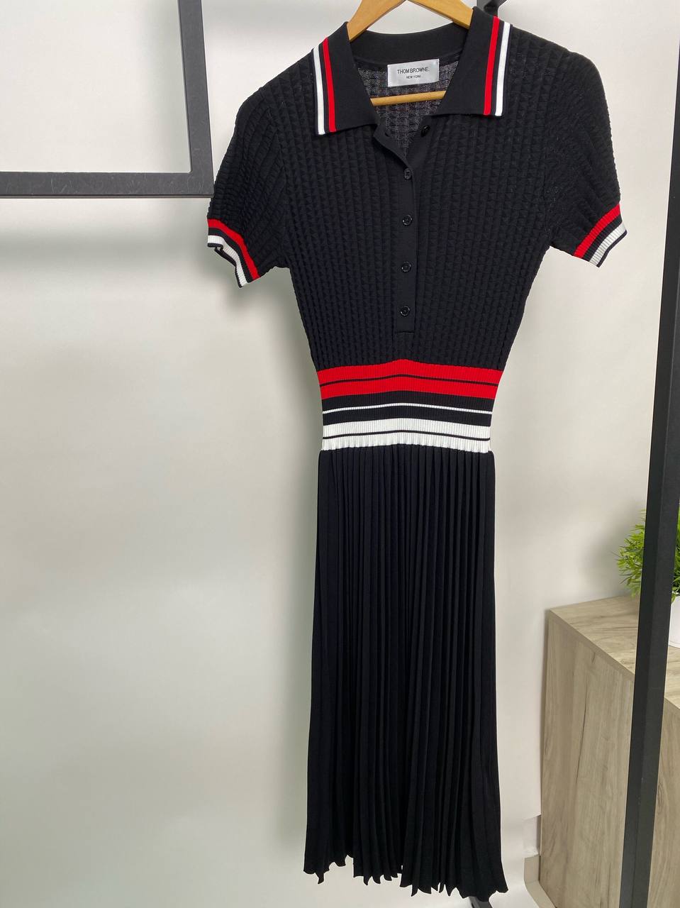 Это элегантное трикотажное платье-поло от Thom Browne LUX-51703 с коротким рукавом и акцентными полосами в красно-бело-черной гамме. Модель дополнена отложным воротником и планкой с пуговицами, а также плиссированной юбкой, придающей образу легкость и женственность. Платье прекрасно подойдет для создания стильных повседневных и вечерних образов.